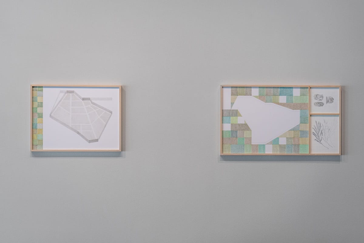 Lotfi's work explores the binary of borders as well. In her Counter Landscapes series, she shifts the map drawing to one that upends the colonial structures of the garden and allows it to be reflective of the organic environment itself, referencing colors found in the Southwest region, as well as rubbings of branches, rocks, and other natural materials collected in the Sonoran Desert. By drawing attention to and highlighting borders, Lotfi wedges a sharp critique, and in many ways, erodes the foundations on which borders are built, creating an imagined borderless future.