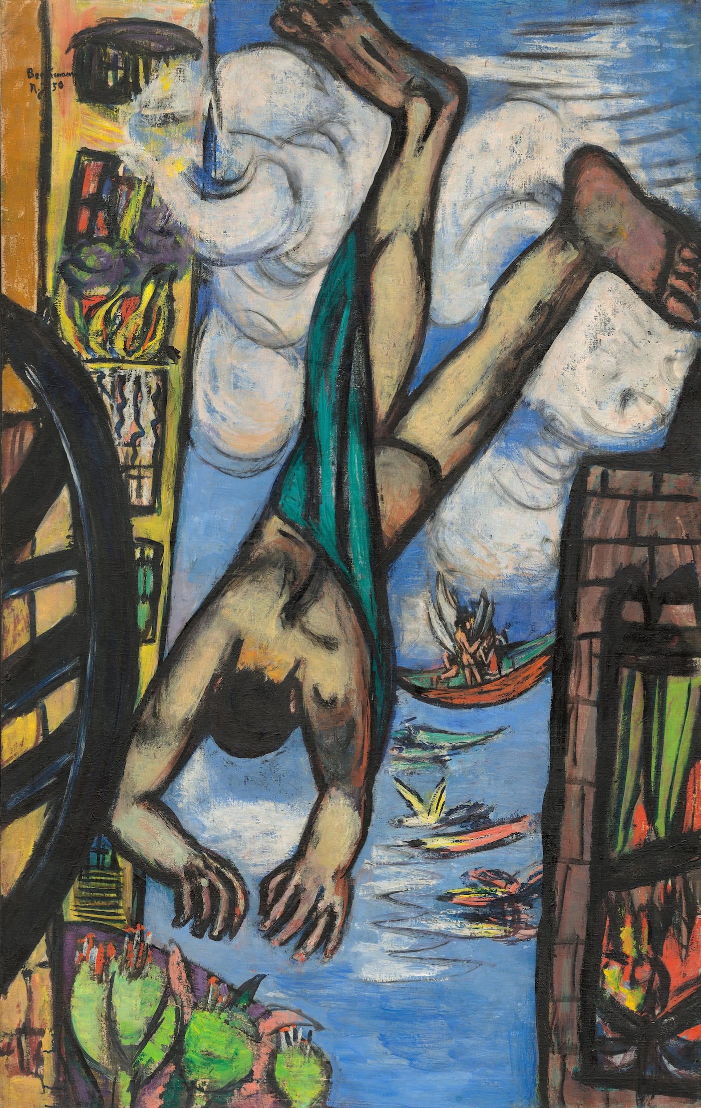 His painting “Falling Man” is difficult to explain, which makes it tempting for an art historian to describe it as a foreshadowing of television news images we saw on 9/11. The painting has also been interpreted as an illustration of Beckmann’s spiritual interests. Like other artists of his generation, he was interested in Theosophy, the concept of the fourth dimension, and he studied Indian philosophy and the Vedas. And yes, Beckmann seemed to embrace the idea, as an artist, that he could be a seer and truth-teller. But “Falling Man” is magic by its own internal, impossible contradictions. The legs and feet are oversized, weighty, splayed, taking up a large piece of the upper part of the painting. Clouds are pressed up against the picture plane; they are thick, tangible paint, all about air and atmosphere, yet they are also light enough to pass though the figure and the tall building at the left.