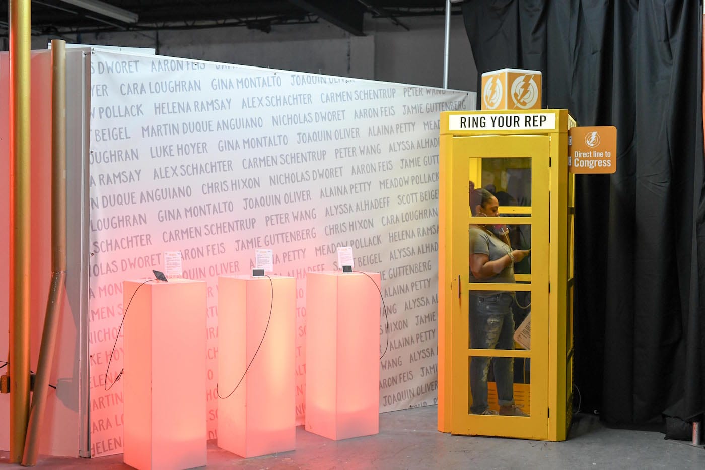 On another wall are 96 crudely-drawn tally marks. On average, according to the U.S. Centers for Disease Control and Prevention, 96 Americans die every day from gun violence. It’s a statistic repeated elsewhere in the exhibition, on wallpaper designed by Pestaina that contained information on how many women are killed from gun violence, and how the US compares to other countries. Visitors who followed the scroll of text were led to a phone booth (courtesy of the Ring Your Rep project by The Standard) that offered a direct line to Congress, along with a script from Citizens United demanding change. Barnett told Hyperallergic that the phone booth was significant to her. “I was inspired by how the survivors of Parkland have been able to galvanize a nation,” she said. “They refuse to be victims and are demanding that their voices be heard. I wanted to create a space where everyone’s voice could be heard.”