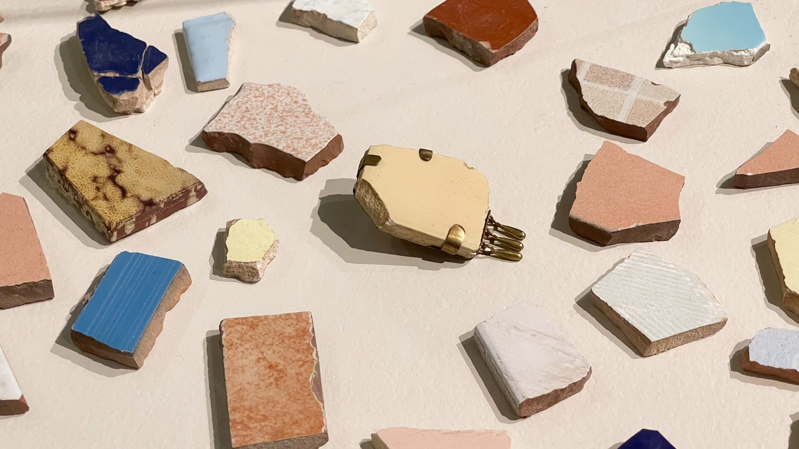 Cassandra Adame carries the conversation of fabricated objects in relation to our experience in the region. Adame’s practice includes walks around Juárez neighborhoods collecting fragments of old buildings-turned-ruins and using these pieces as inspiration and material for her jewelry. The artist converts waste into souvenirs that are simultaneously delicate and rough, highlighting the consequences of human intervention, creation, and eventual abandonment. The act of turning these bits into pieces to be worn physically close to the heart, such as the brooch in “Tierra de nadie (No Man’s Land)” (2019), alludes to the intimate memories we assign to materials that once served as shelter against the environment.