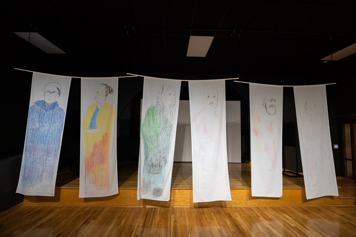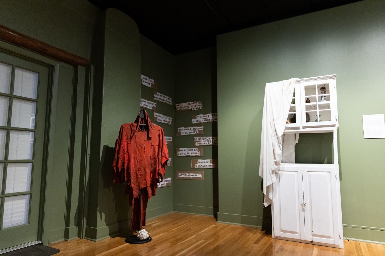 Continuing the discussion in a powerful performance during the opening of the exhibition, Alexandra Rodríguez and Octavio Castrejón conversed between themselves as they reimagined their original piece. “Y fue aquí, en este lugar desolado, donde aprendió a vivir de nuevo (And It Was Here, in This Desolate Place, Where They Learned to Live Again)” (2019) consists of two textile sculptures in the shape of capes built with found material and inspired by the defense mechanisms of desert nature, such as thornes and camouflage. Similar to Gracia Emelia Chávez-Ortiz’s work, certain elements of the garments included organic material that was prohibited from crossing the international border. Instead of contrabanding or replacing these parts, and prompted by phrases on cardboard that became part of their work, the artists took the opportunity to ponder the reification that traditionally occurs in art, questioning the sanitation processes that cultural institutions inherently apply to ideas and narratives, many times altering and reducing them in an effort to distill them. The pair also questions the inferred qualities of objects, bringing to light the absurdity of distinctions that make matter in different stages safe or acceptable, such as cardboard or a wooden furniture — both permissible across the border — while the raw wood they come from is not. Rodríguez and Castrejón ultimately created a space for reflection about current international policies in which images and objects are admissible across borders while nature, humans included, is not.