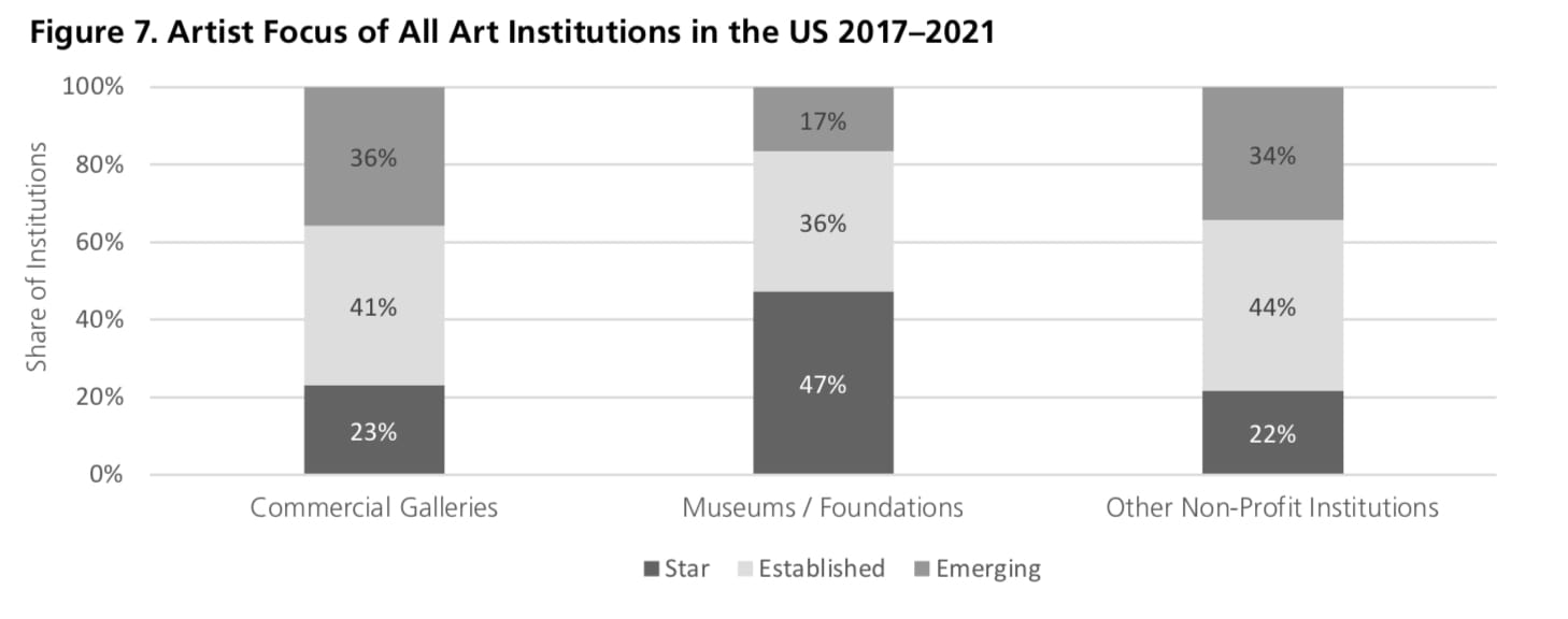 "This indicates that commercial galleries in the US play a critical role in the careers of artists, with a range of different galleries focused on artists at different career stages," the report reads. "Unlike most museums, galleries are important from an early stage, and feature in the exhibition programs of artists all the way through their careers."