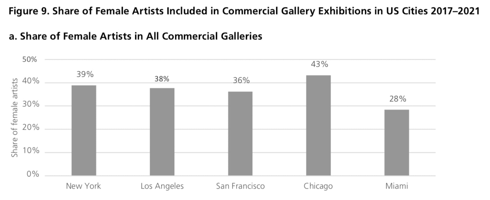 For women artists, the answer may be surprising. "Miami stood out as the only city where emerging female artists were more likely to be exhibited for the first time over their male peers in both the museum and commercial gallery sectors, indicating that it could be an important testing ground for some artists that go on to be successful elsewhere," the report's authors wrote.