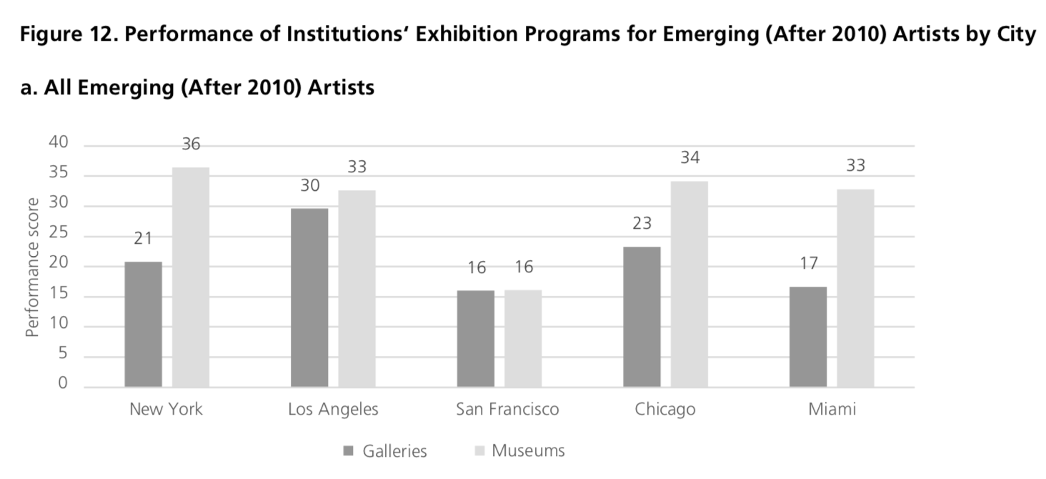 The report identified the five American cities with the most art institutions — New York City, Los Angeles, San Francisco, Chicago, and Miami — and ranked their galleries and museums based on the proportion of star, established, and emerging artists they represented. San Francisco and Chicago had the highest percentage of galleries centering emerging artists (39%) and Los Angeles and Chicago had the most museums focused on them (21% and 24%, respectively).