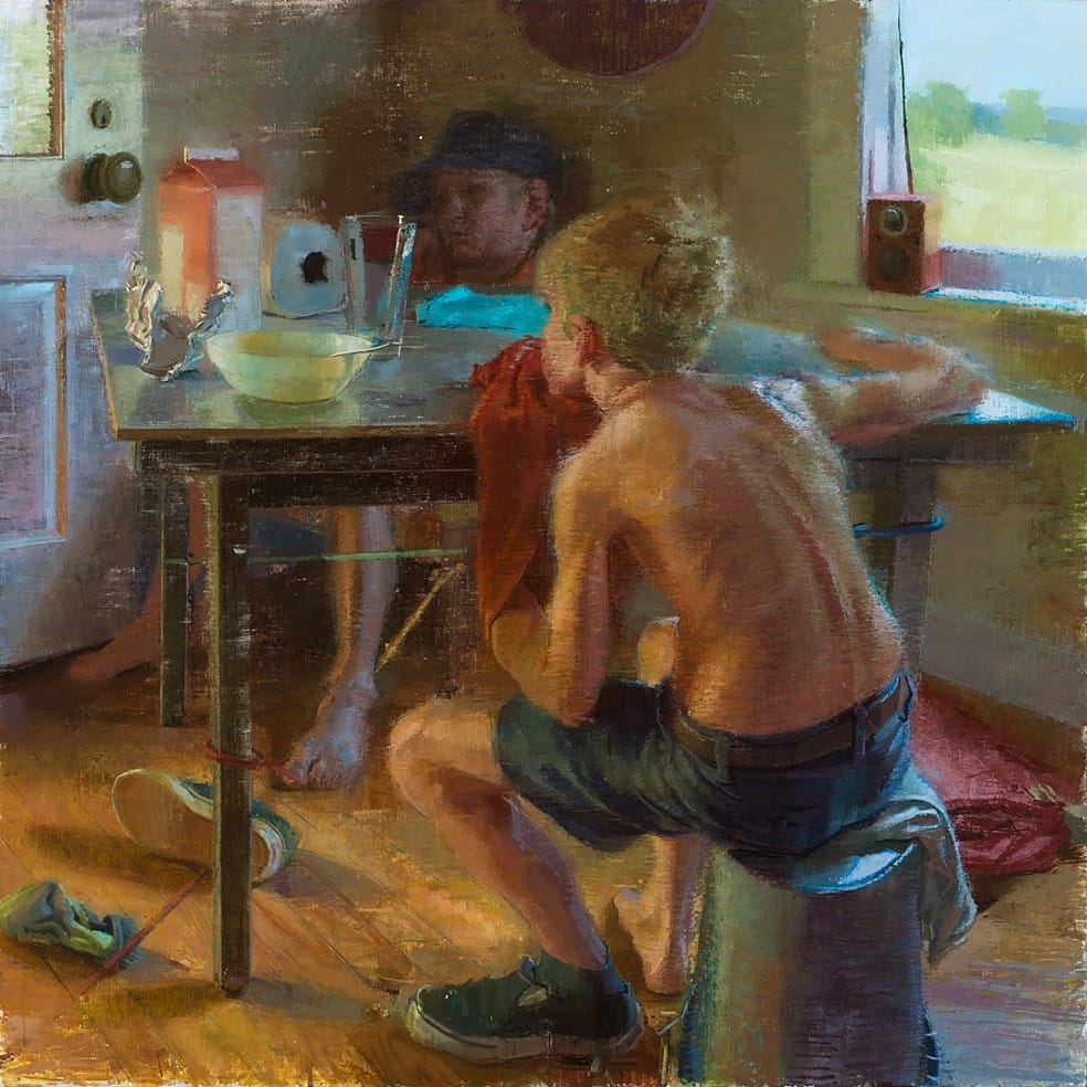 In these two tondos, Callander is attentive to specific details, as well as surfaces and light, while in works such as “Annunciation Afternoon” (2016), he paints the atmosphere as much as the two people sitting at a table, intent on capturing something that we cannot see. In another tondo, “New Watermelon Darts” (2018), he has added wood panels to the original rectangle. A boy in profile is in the foreground throwing darts, while the space that he is standing in recedes to the garage door; a van occupies the space in between the boy and the garage door. The exposed ceiling, insulation, and pipes are beautifully painted, at once rough and precise. The boy’s bright lime-green jersey — in contrast to the muted colors of his surroundings — is like a traffic light inviting us to go past him and see the attention Callander has paid to the lawnmower, ladder, and overhead fluorescent light.