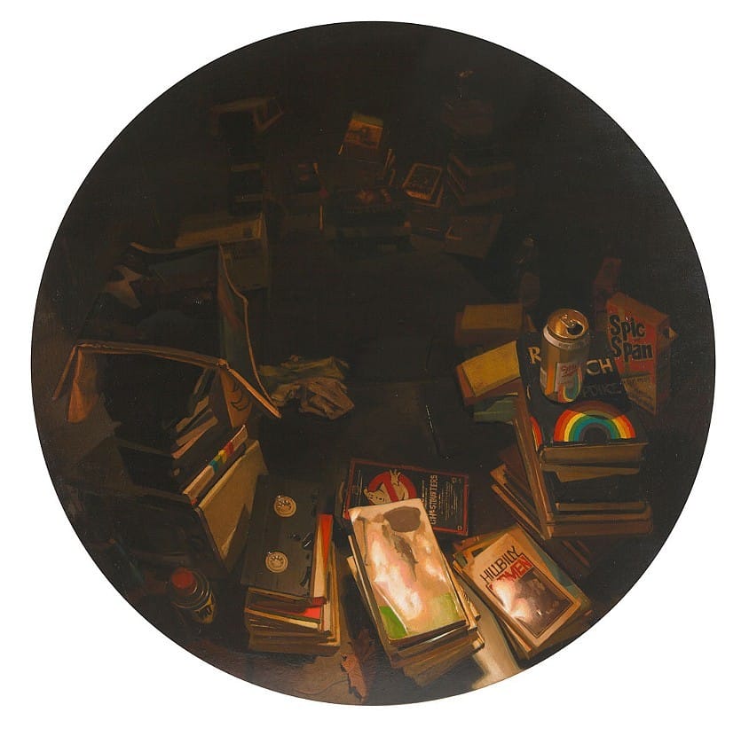 An open can of Miller beer sits atop one stack of paperbacks, partially obscuring the title of John Updike’s novel, Rabbit Is Rich. An orange-and-blue box of Spic And Span household cleaner is visible nearby. The glare of the overhead light is reflected by the laminated covers of the paperbacks, which have been stacked near the tondo’s lower edge, making one cover hard to read and the other partially legible. The surface on which everything sits recedes at a relatively sharp angle, while rising to the midpoint of the tondo. The upper half of the painting is a mirror bathed in darkness, dimly reflecting what is below.