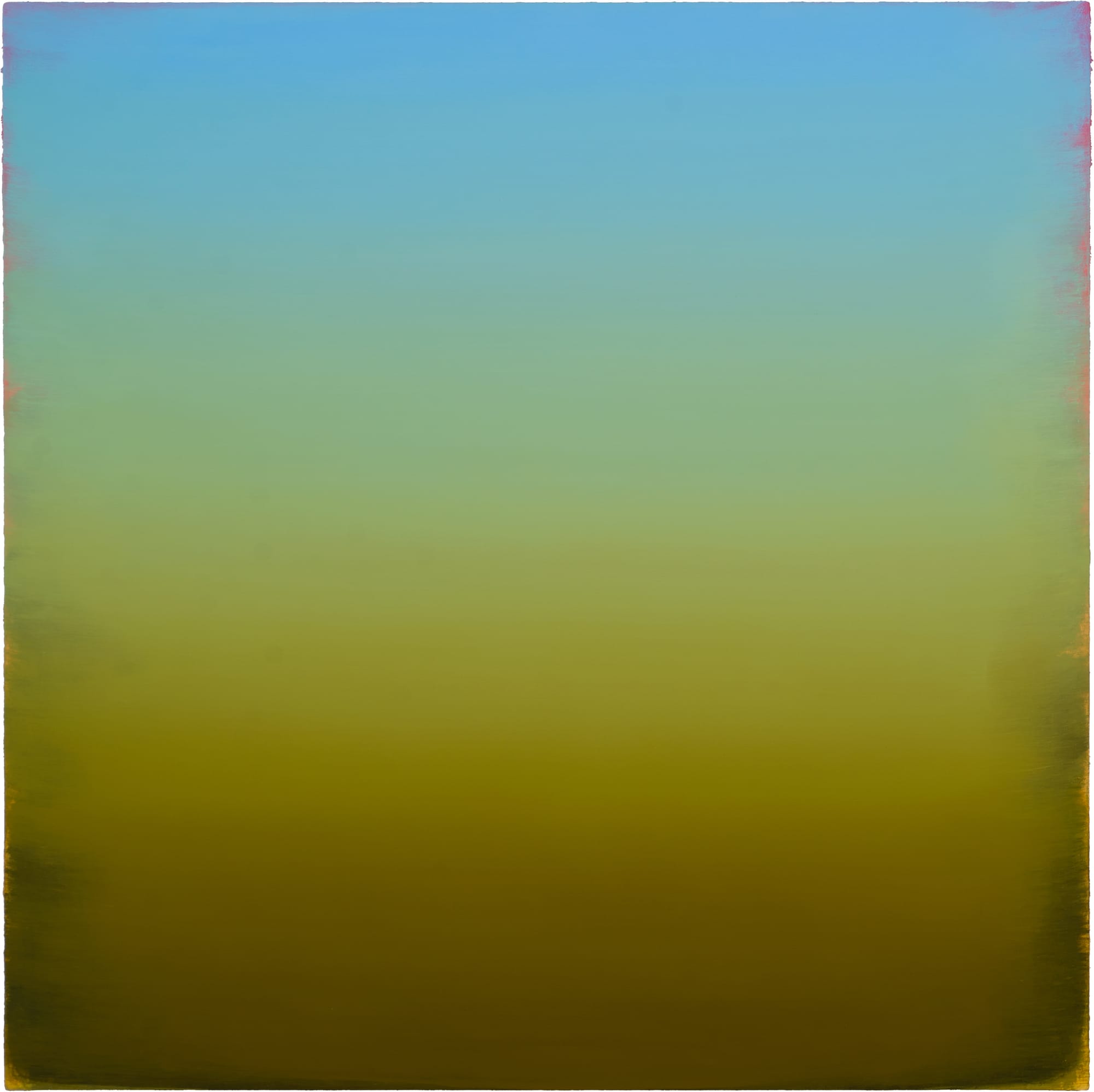 Callander can pivot from these different approaches to perceptual and observational views, to something that might initially appear purely abstract. In the square painting “Gradation Skyblue Large (2019), he empties objects out of the painting. The surface is a carefully adjusted blend of ochre along the bottom edge, turning to sour green-yellow as it rises, and finally becoming blue near the top edge, with bits of red flaring out along the upper right and left edges. The painting seems to be two things at once: an abstract field of a slowly changing hues and an evocation of a polluted sky.