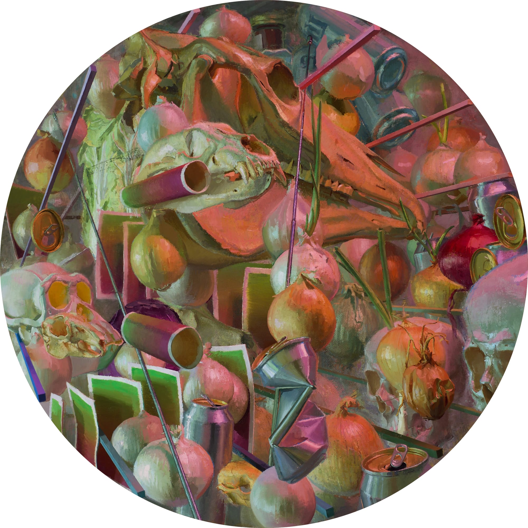 “Healing Grounds” presents a straight-ahead view, the painting’s circular edge cropping everything outside its circumference. Callander had to paint it in layers, working from the back toward the front, adding more objects, as well as repositioning them, as he went along. By giving himself this problem, he was able to discover how much the painting could contain. And yet, I do not think of “Healing Ground” as a painting exercise. It undoes the basic convention of still life (objects collected on a surface). The choice of onions (orbs) and metal cans (cylinders) do not seem arbitrary either. One can imagine these objects, and possibly the skulls, sitting on a table somewhere in America.
