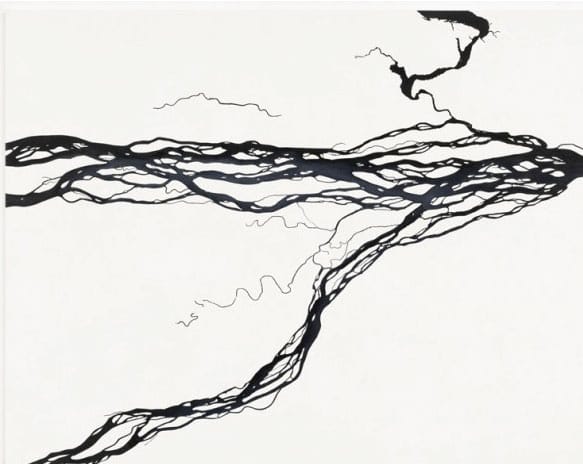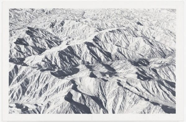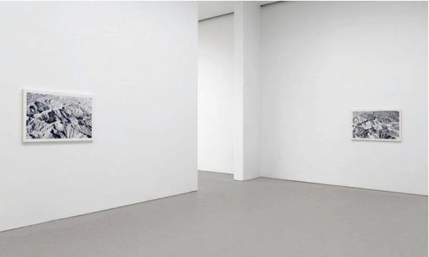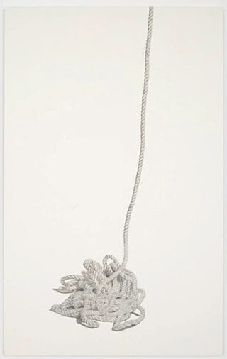 This is what I saw in Zwirner’s space — bland, uptight paintings (each of them had a white border around the black-and-white image) of barren mountain ranges (are we supposed to think Afghanistan?), unspooling rivers, lattices of trees, and various images of rope crisscrossed or hanging from the painting’s top edge. The paintings seemed like Vija Celmins lite, coasting smoothly along on skillful illustration rather than making something through drawing or painting (countless decisions).