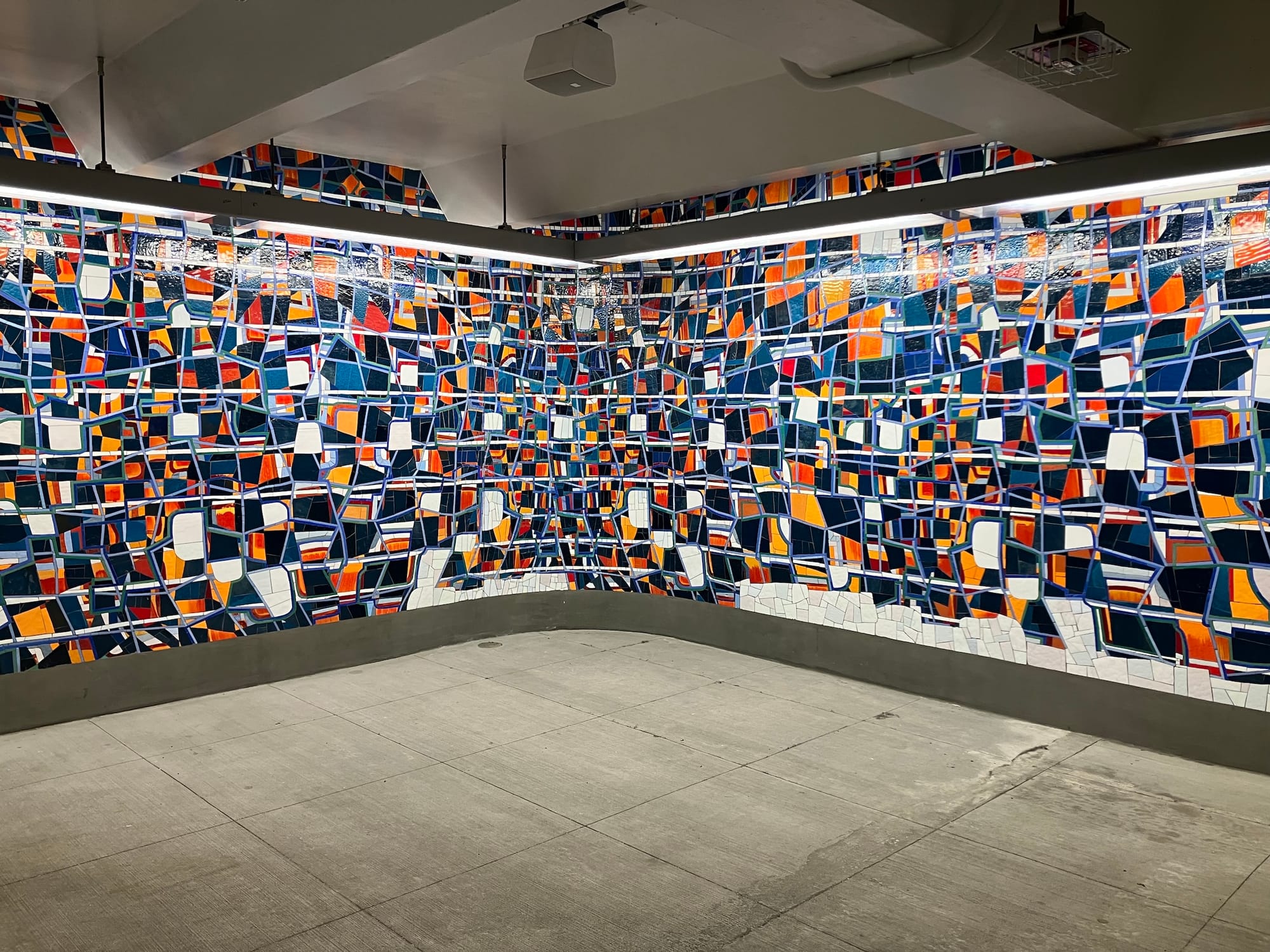 The Metropolitan Transportation Authority (MTA) Arts and Design commissioned Lisa Corinne Davis, a Brooklyn-based abstract painter and a professor of art and co-MFA director at the Upper East Side college, to create three glass mosaics for the transit stop, inaugurated on January 23. Davis’s “Tempestuous Terrain” (2024), spanning a 29-foot curved wall at one of the station’s entrances, and two adjacent works titled “Liminal Location” (2024) situated in front of an MTA service booth, now fill nearly 370 square feet of the student-traversed station.