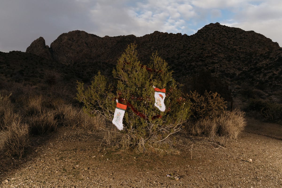 “Since the ’80s, a more westernized history of decorating the trees, or kind of vandalizing littering them with objects in the name of tradition, has occurred. In the late ’90s, they tried to crack down on it. But the tradition continues. You see those little tinsel shreds flying off into the wind — there's nothing worse than watching birds try to eat them or seeing them get stuck in cactuses,” she says. “So I just really wanted to make an honest representation of what this would look like if you went out and visited the area. Then I got that photo, I cleaned up the tree and removed all the litter. I went back about a month later and photographed it and followed up to see the progress and health of the tree, and to give my regards to it. And in the gallery, we paired both of those photos with a piece of garland that came from the tree.”