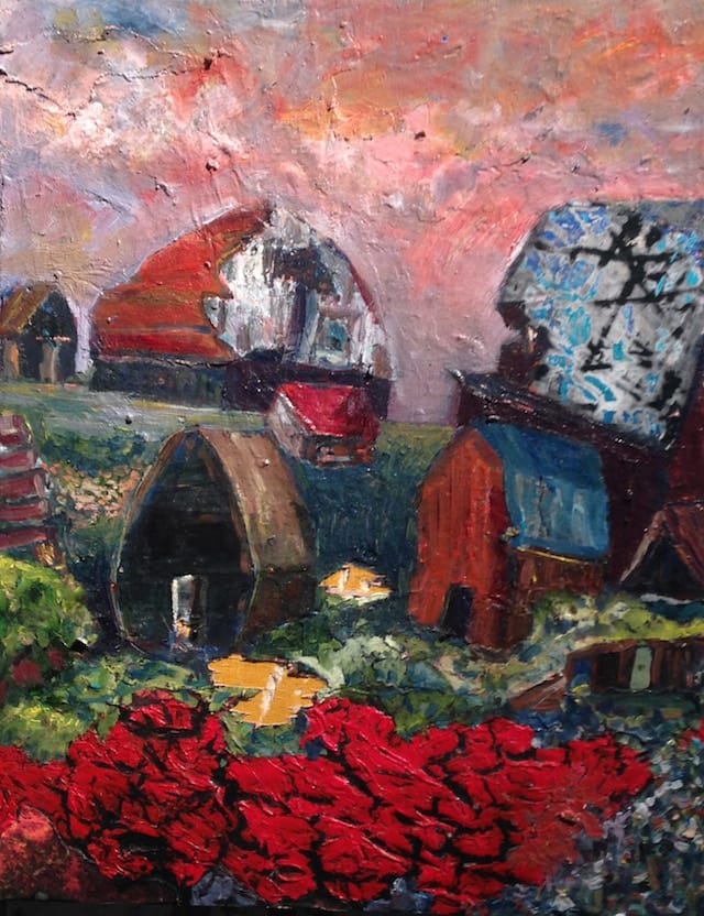 The clarity of his memory is at times impressive. In “Untitled (farm)” the way some buildings appear to be abandoned as others fall slowly into decay is lovingly documented. What makes this small village scene so compelling is the inventiveness with which Sayaphet treats the architectural textures and invasive floral growth that flesh out his remembered Laos.