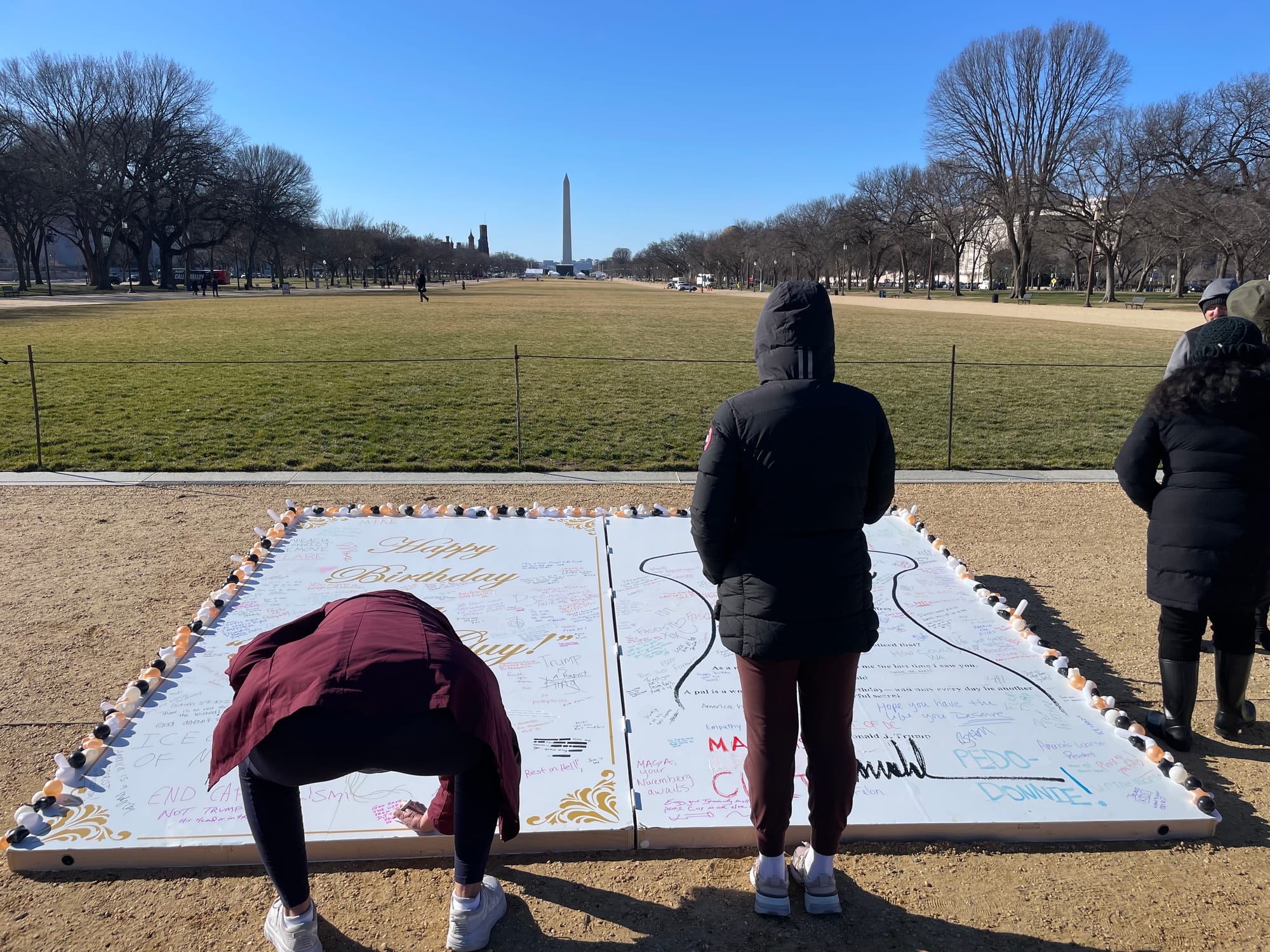While the card was standing up on its shorter end when it was first erected, it was lying almost flat on the gravel on the National Mall today when Hyperallergic visited the piece on Tuesday afternoon. Around a dozen people were surrounding the artwork, many of whom were using the provided markers to cover the card in written notes admonishing Trump and his administration.