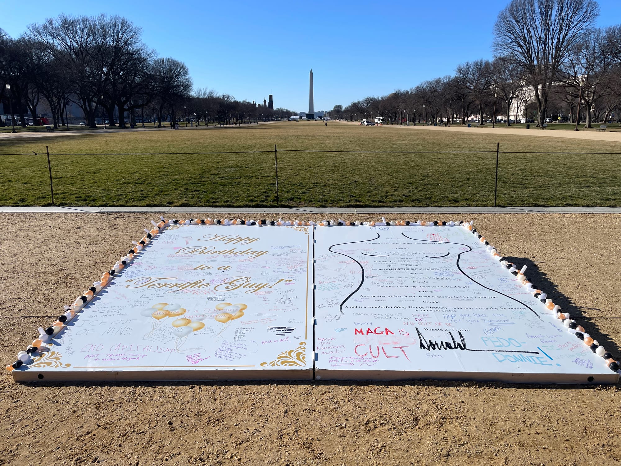 New Artwork on National Mall Lampoons Trump-Epstein Birthday Card