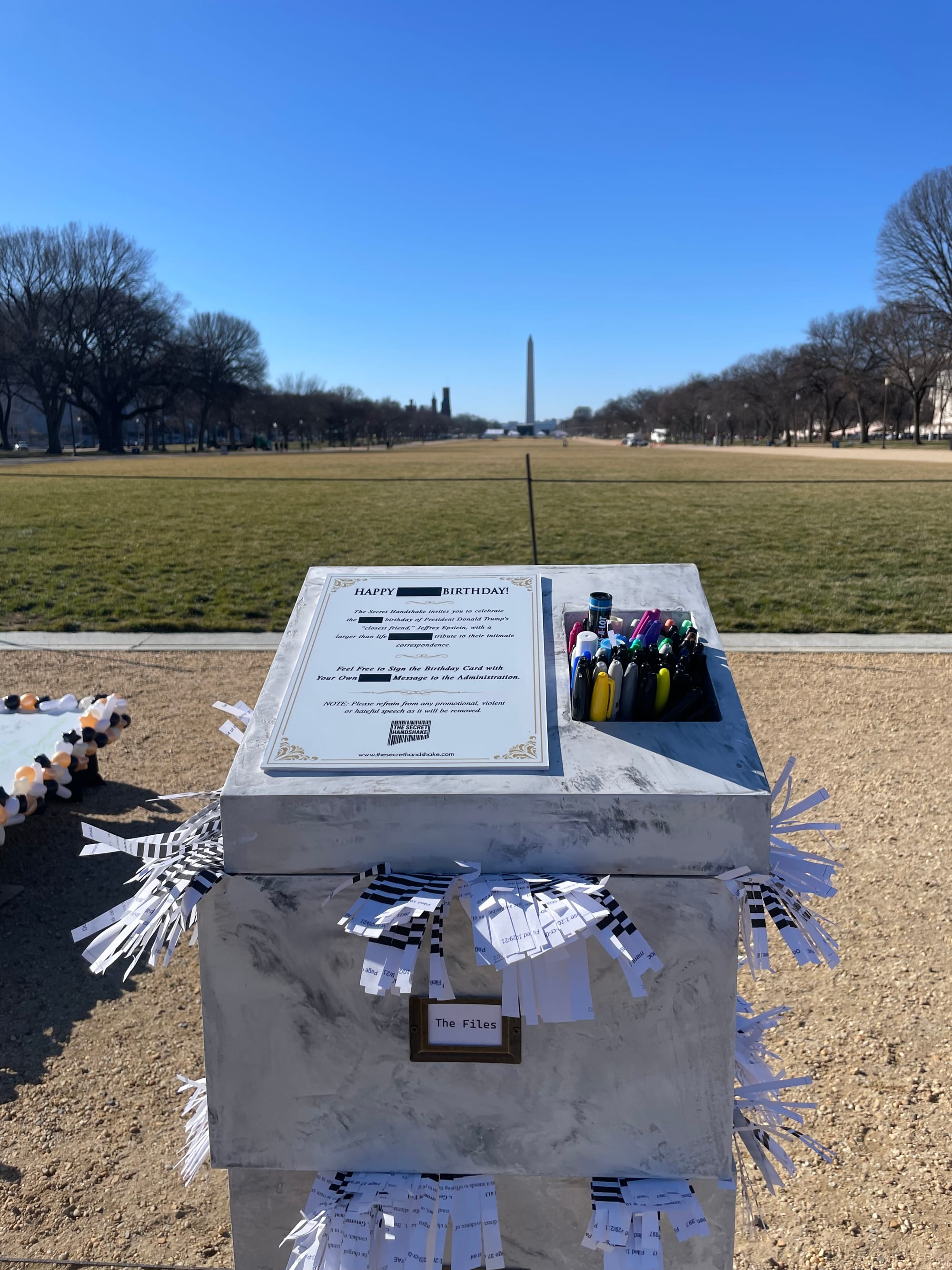 Alongside the card is a sculpture of stacked boxes and overflowing paper shreds with blacked-out words, alluding to the heavily redacted files released by the Department of Justice in December, and a selection of Sharpie markers for public use. A plaque invites visitors to “sign the birthday card with your own message to the administration” and “celebrate the birthday of President Donald Trump’s ‘closest friend,’ Jeffrey Epstein, with a larger than life tribute to their intimate correspondence.”
