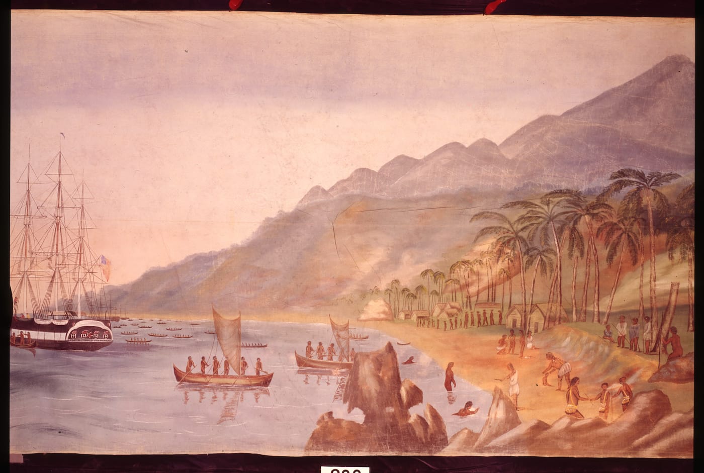 The New Bedford Whaling Museum has a Flickr album of 150 details of the panorama, including the departure of the vessel from New Bedford and encounters with volcanoes, shipwrecks, indigenous island communities, and, of course, whales. Russell collaborated with an area sign painter named Caleb Purrington, and together they spent a year creating the work.