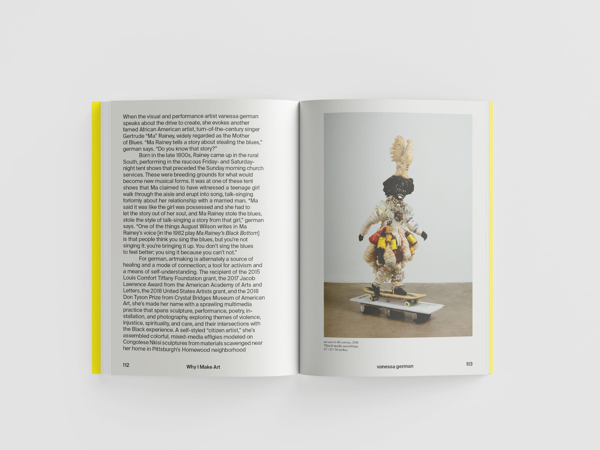 Page spread featuring Vanessa German from Brian Alfred, Why I Make Art: Contemporary Artists' Stories About Life and Work, Atelier Éditions, 2022 (courtesy Atelier Éditions)