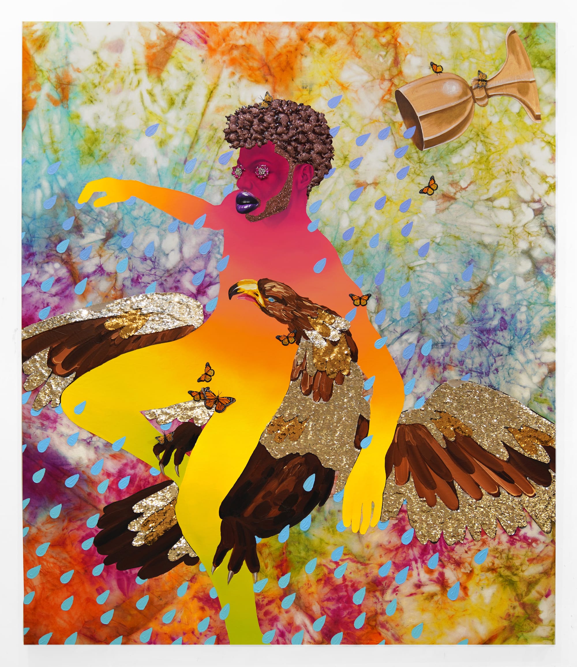 Devan Shimoyama, "The Abduction of Ganymede" (2019), oil, colored pencil, dye, sequins, collage, glitter, and jewelry on canvas, 84 × 72 inches (courtesy the artist)