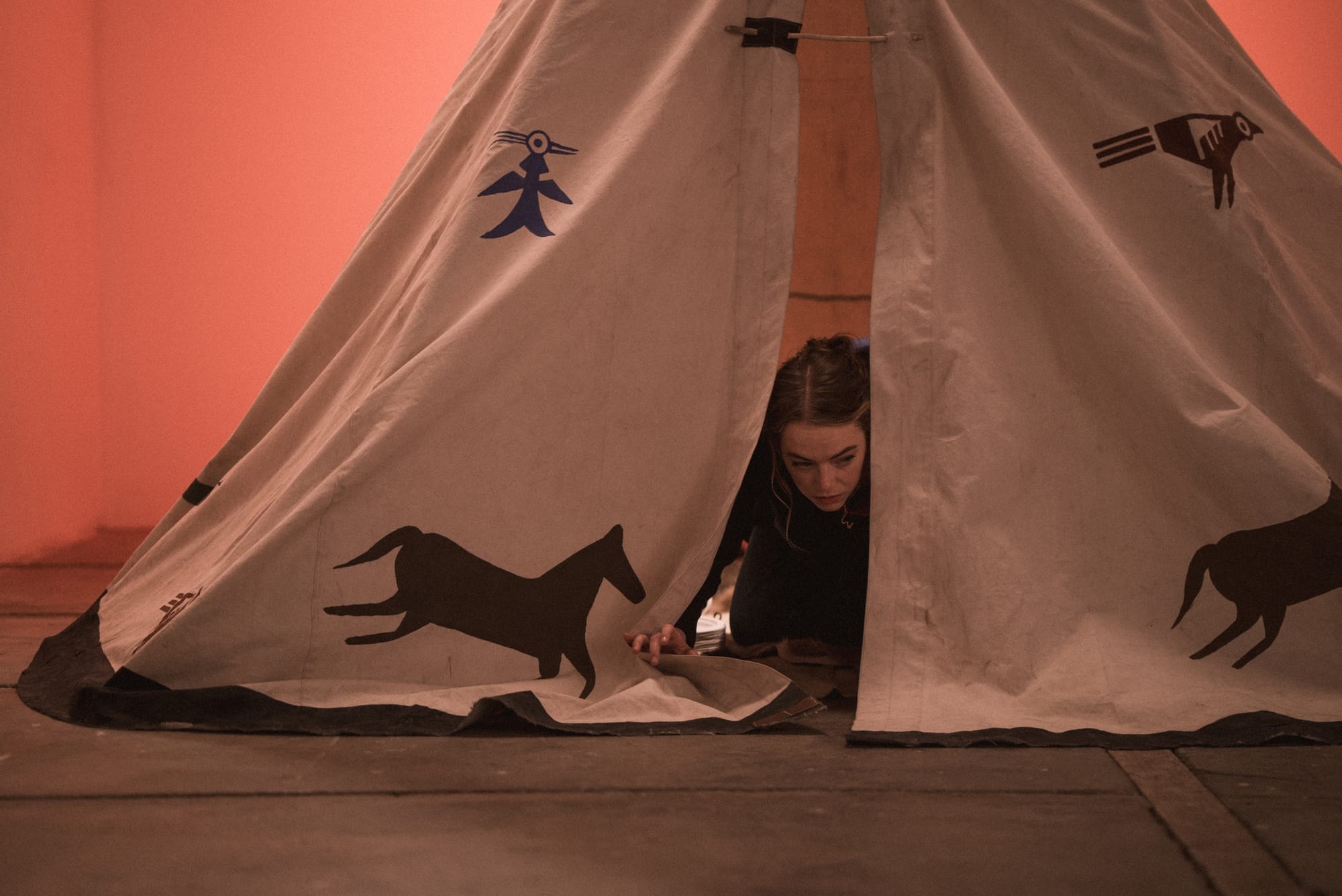 Later, at Durand’s exhibition, the artist stages a performance in a tipi as Whitney enters and sits across from her. Durand runs a hunk of turkey through a meat slicer, handing the plate of meat to Whitney, who puts some in her mouth, in a stylized reimagining of Thanksgiving. Durand utters a tortured scream and asks: “Why did you do that?” to which Whitney replies, stunned, “Was I not supposed to eat it?”