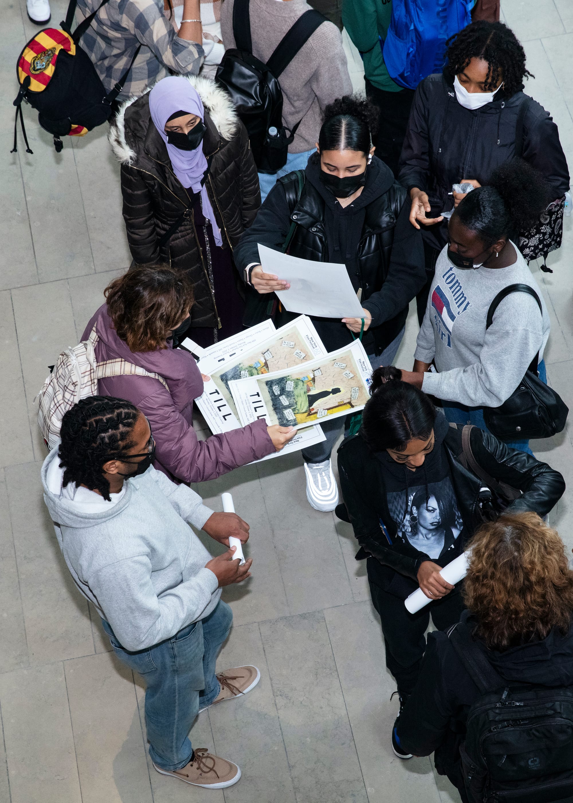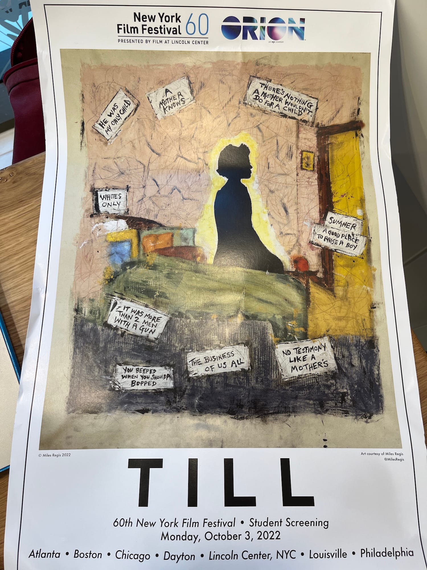 Each student took home a poster designed by artist Miles Regis specially designed for the community screening event. Titled “A Mother Knows (Tribute to Mamie),” it shows Mamie Till-Mobley’s silhouette in profile, surrounded by phrases like “he was my only child” and “it was more than two men with a gun.” “I wanted to honor the love bond between Mamie and Emmett,” Regis told Hyperallergic. He explained that the film felt particularly personal to him as the father of two children.