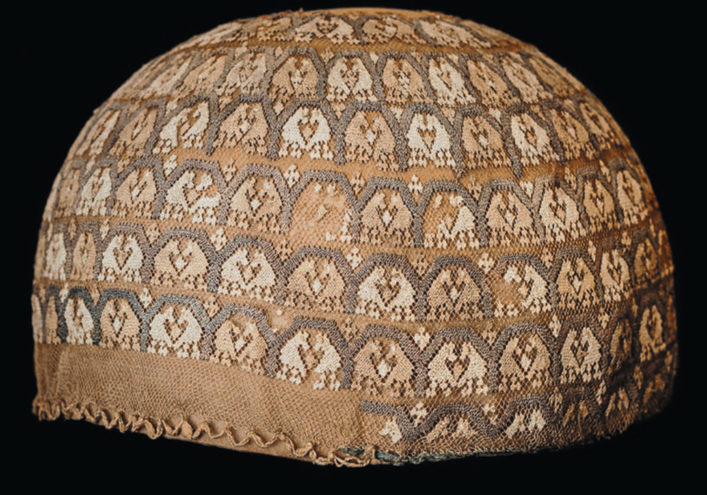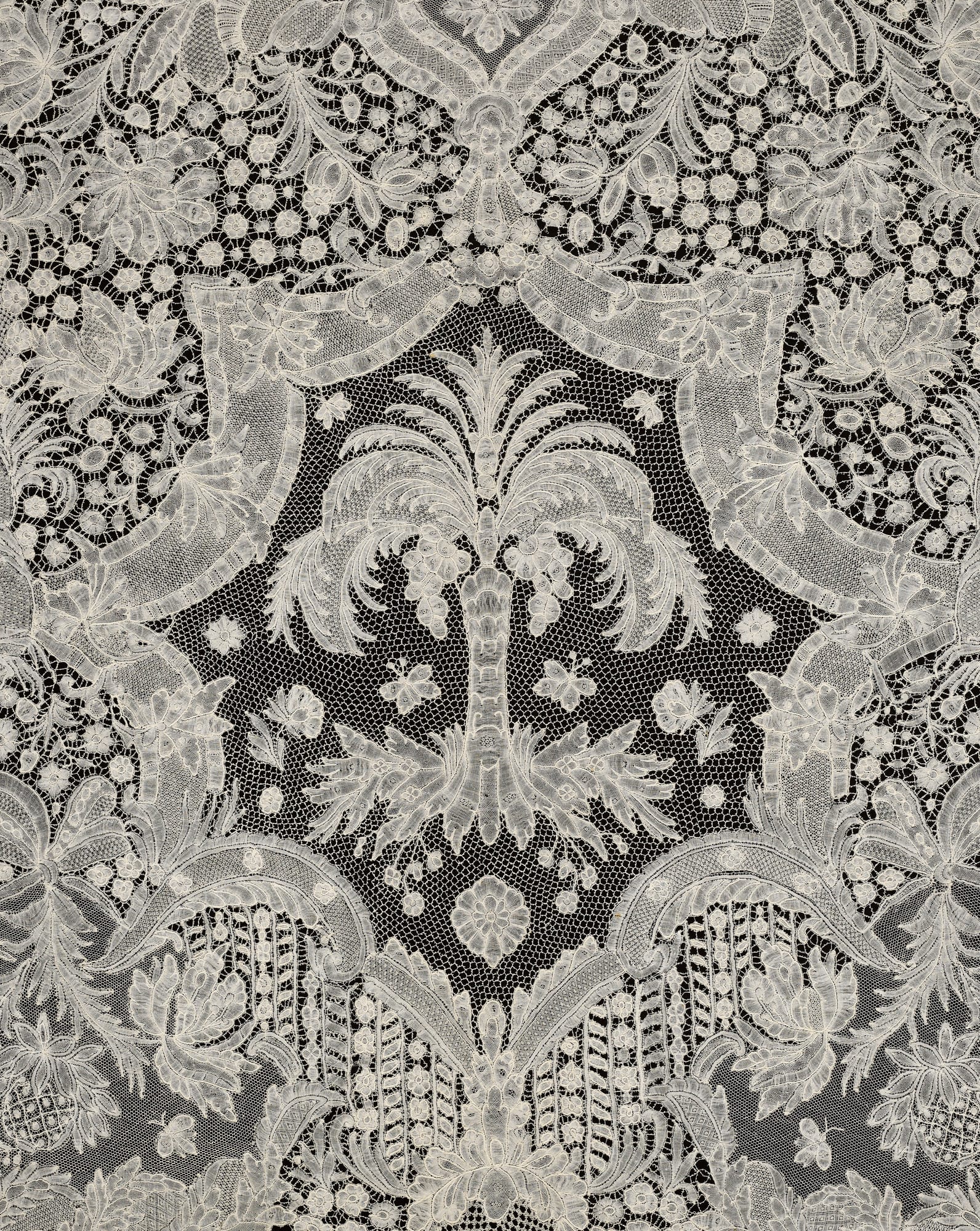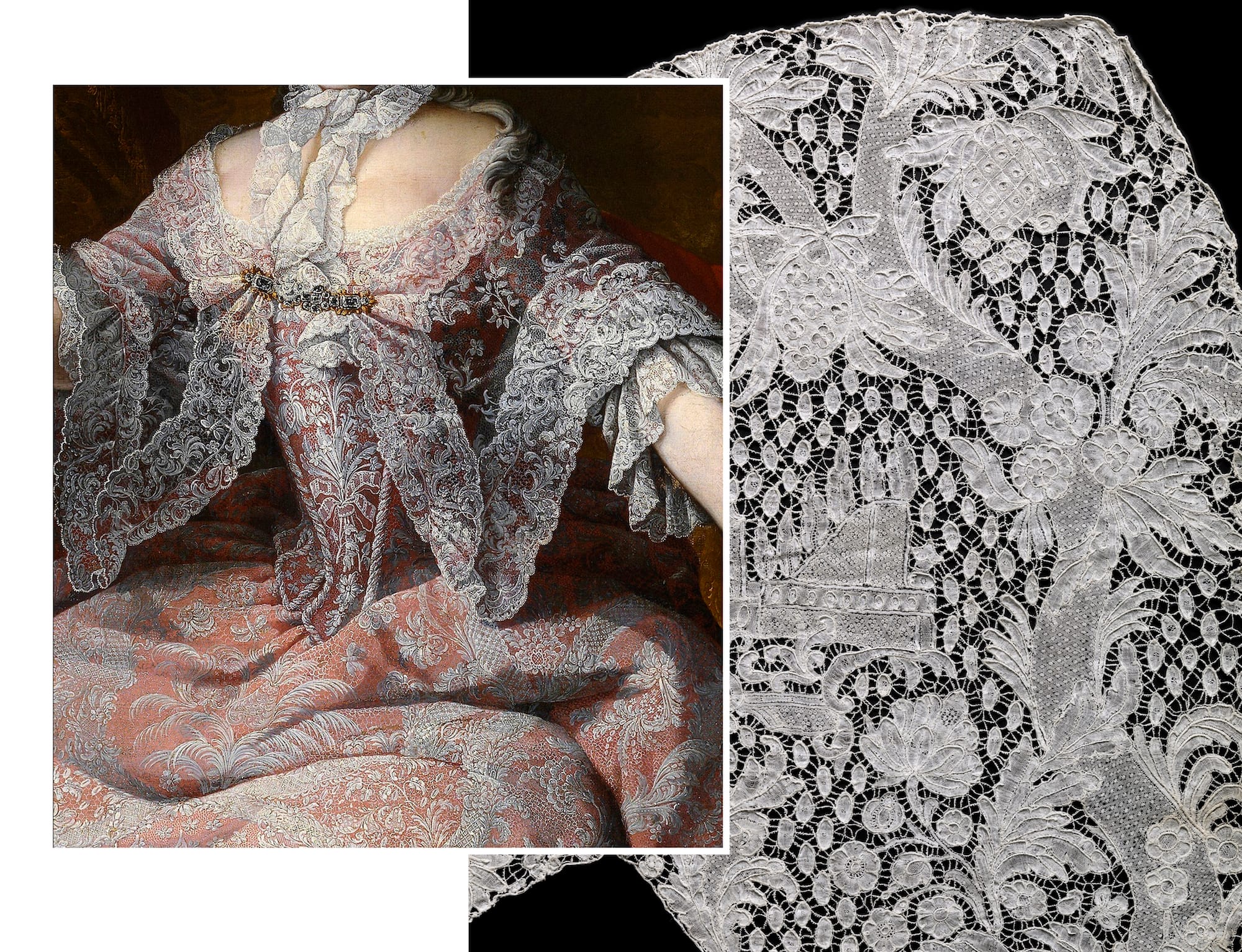 Lace is a relatively modern development, unlike weaving and embroidery, which had both been in existence for thousands of years.An accompanying publication from Lannoo publishers traces the evolution of the latticed pattern, from early forerunners like pre-Columbian woven cotton textiles to the development of bobbin lacemaking. Paintings and other media, in addition to patterns and pattern books, were critical primary sources for the exhibition, and Old Master works are juxtaposed with lace fragments to illustrate their prominence. Matthias De Visch's "Portrait of Empress Maria Theresa" (1749), for instance, is shown with an 18th-century sleeve fragment in bobbin lace from the collection of the Metropolitan Museum of Art.