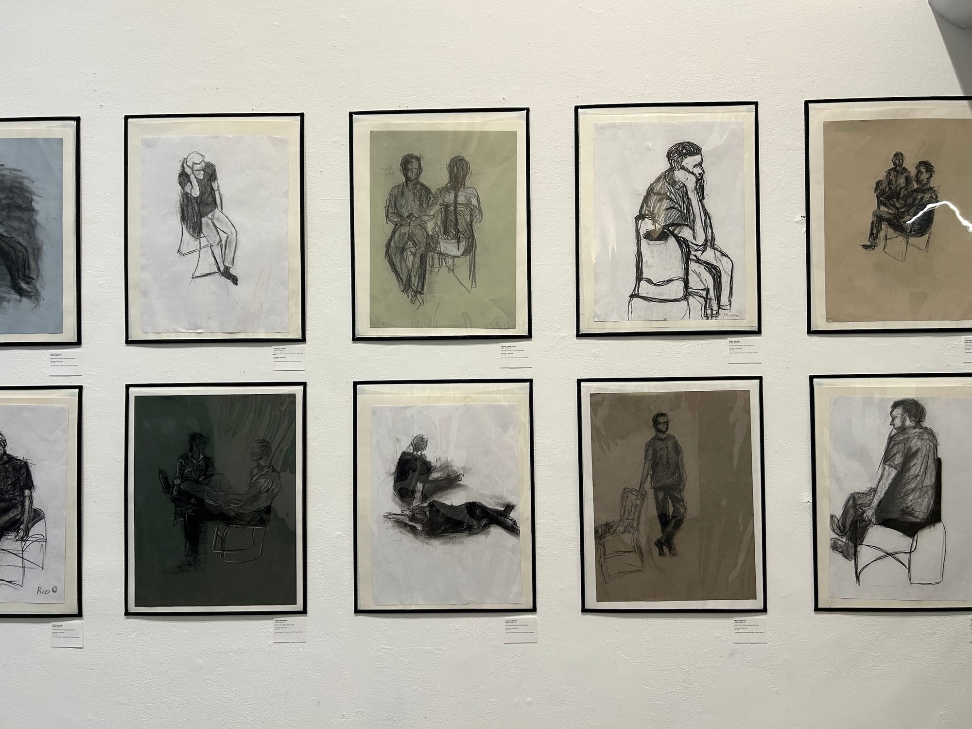 On the other side of the gallery, black-and-white studies of figures resting in chairs, sitting on the ground, and quietly thinking are displayed across two rows. Below, a green-papered charcoal study of two seated models by 11th grader Collin Hammond stands out among the group of pieces. All were made during a workshop meant to help students develop their portfolios by introducing new materials like charcoal and exploring movement and visual texture.