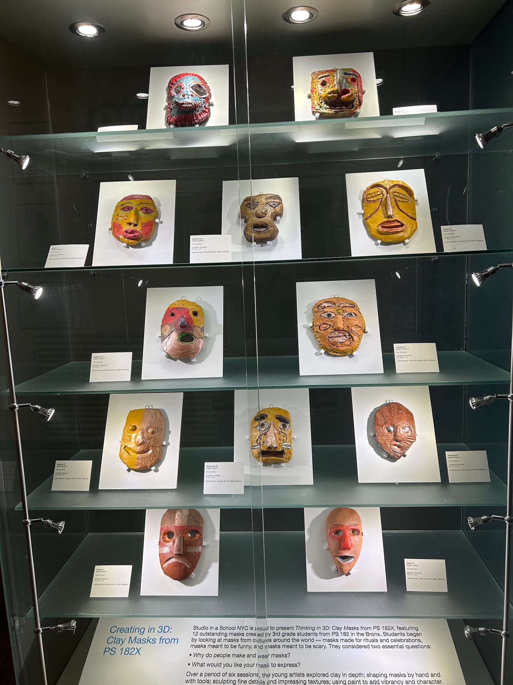 In addition to the work on view for Artists Rising 2025, visitors can see a dozen colorful handmade clay masks created by third-graders in the Bronx. Made over a series of six sessions, the works explore global cultural traditions and a range of facial expressions, from happy-go-lucky smiles to fearful looks of surprise.