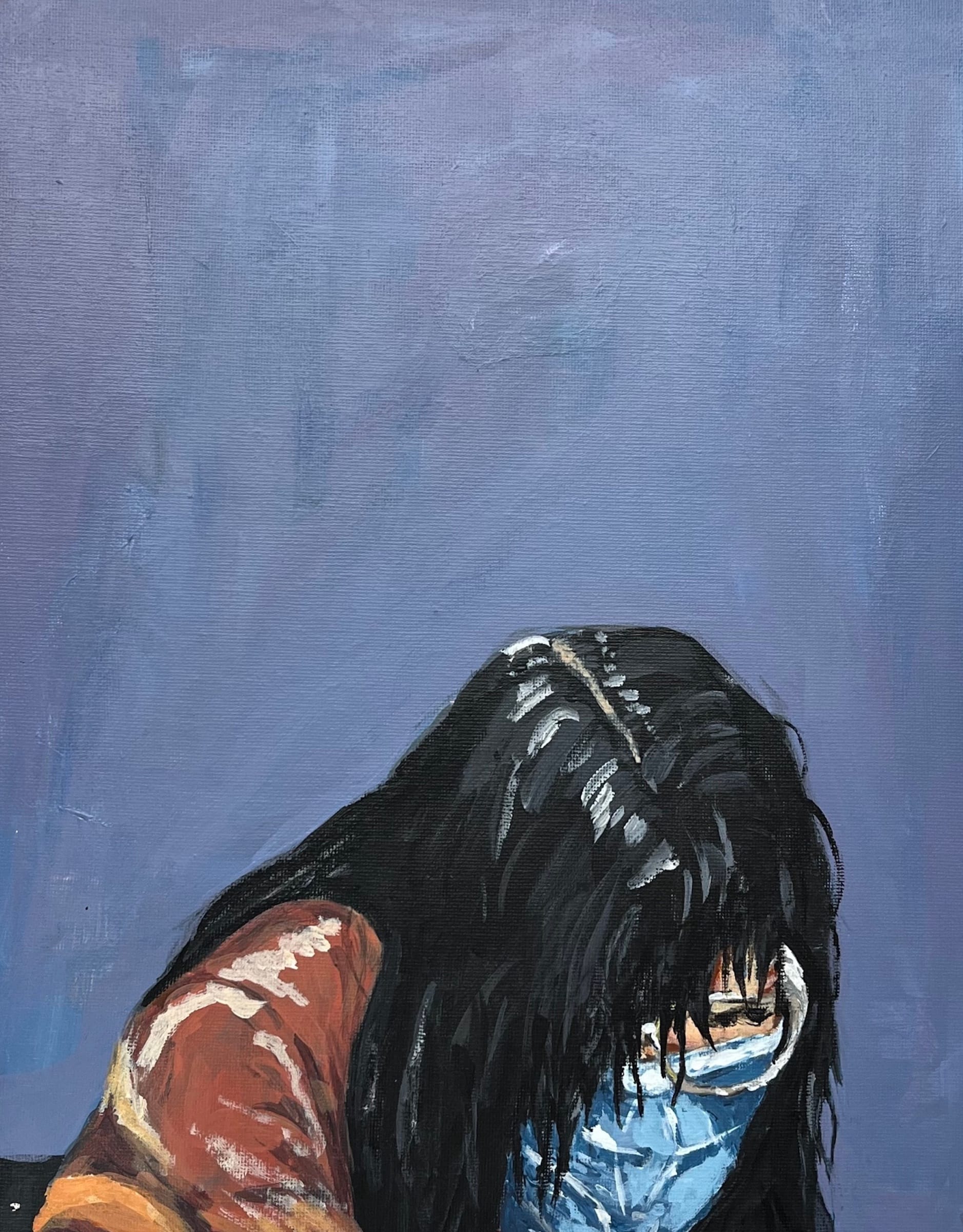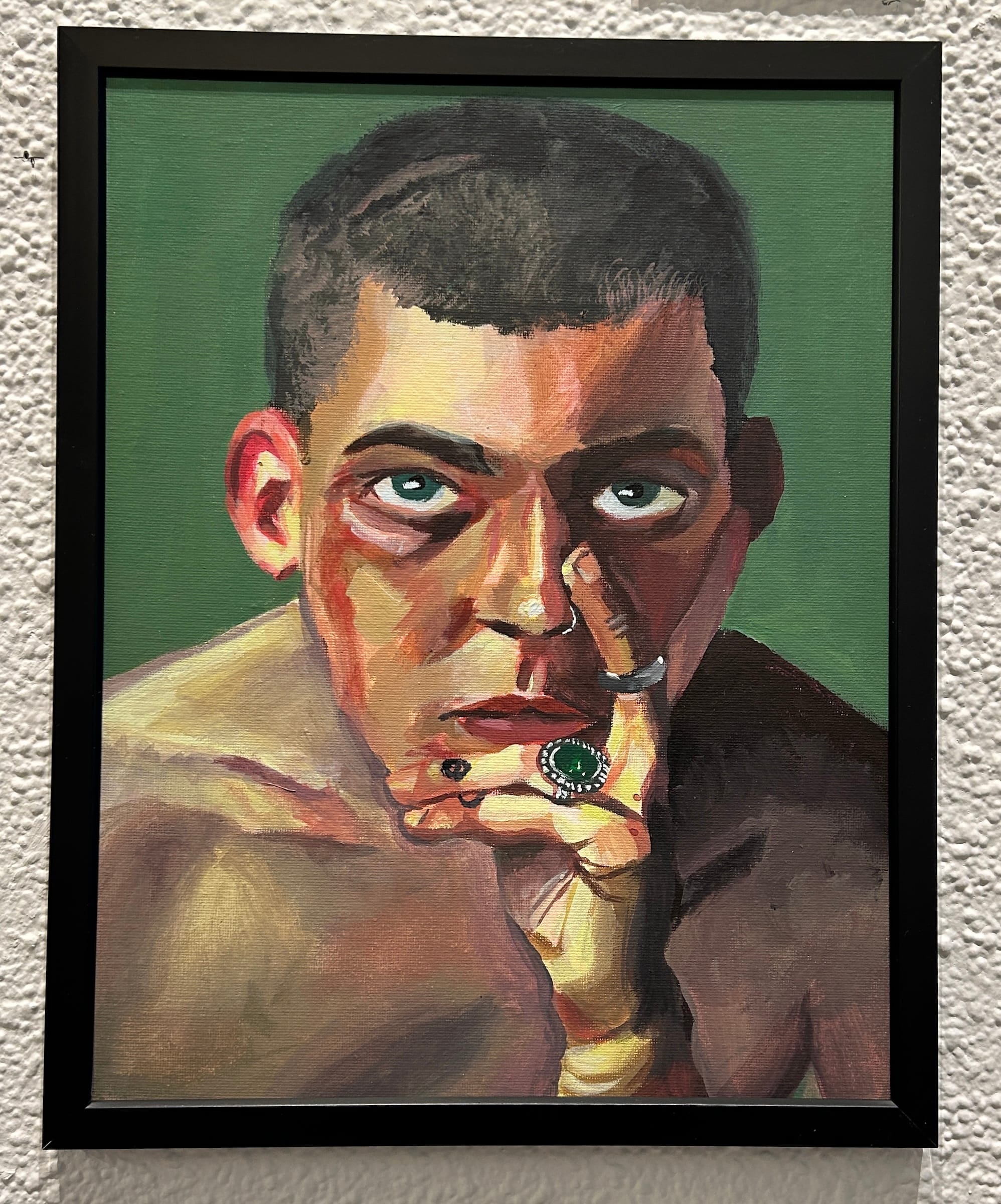 For the most recent workshops that took place in the fall, nearly half of the participants hailed from Manhattan’s High School of Art and Design, but some also came from Brooklyn High School of the Arts, Frank Sinatra School of the Arts, Francis Lewis High School, High School of Fashion Industries, and a variety of other technical schools. The painting workshop focuses on advanced painting techniques, such as layering paints, color mixing, and color theory, as exemplified in works like 10th-grade student Ty Golany’s stoic self-portrait, awash with shadows and hues of red, yellow, and green, and a painting by Patricio German that depicts a figure with their face buried in their hands against a purple-gray background.