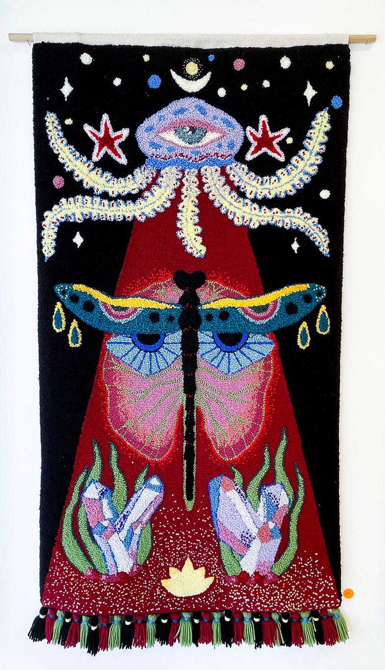 Another artist, Georgia Marutyan, dips into the tradition of esoteric art with her tapestries. “Space Crystals” shows the third eye beaming light down upon a dragonfly. Unlike others who used tufting guns, Marutyan used a punching hand tool, a more laborious, but controlled, process.