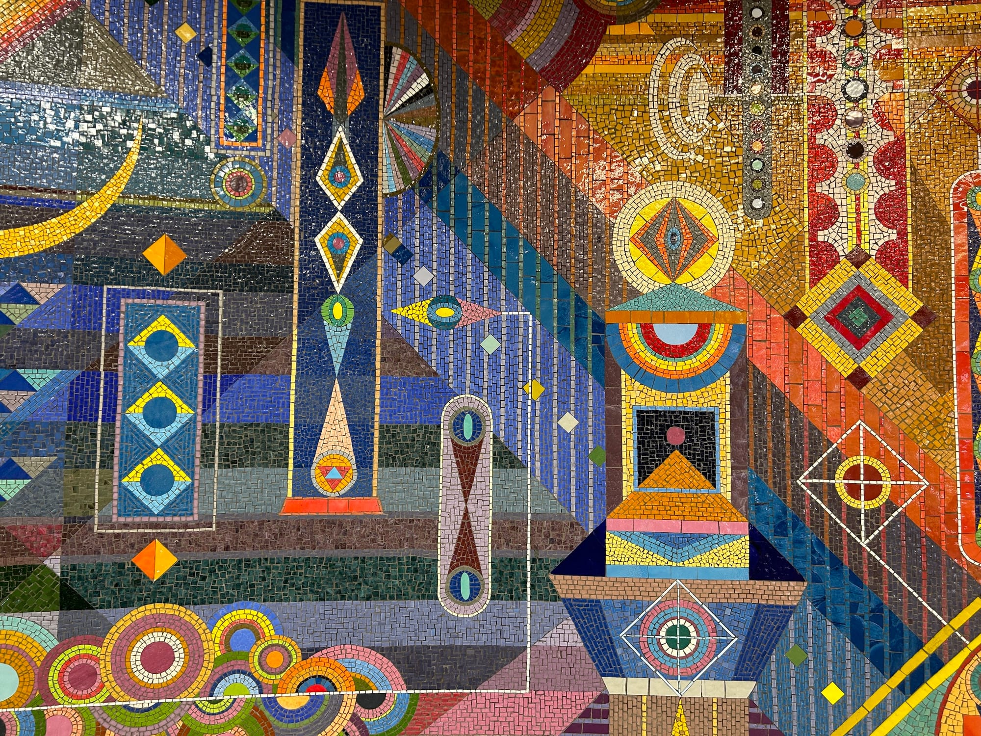 Celestial motifs and cosmological geometries strewn across a prismatic landscape comprise “Abstract Futures” (2025), the newest public artwork to grace the walls of the New York City subway system. Designed by the feminist art collective Hilma’s Ghost, the 600-square-foot glass mosaic mural now greets transit riders between the turnstiles and escalators at the 42nd Street entrance to the 7 train in Manhattan’s Grand Central Station after being installed earlier this month.