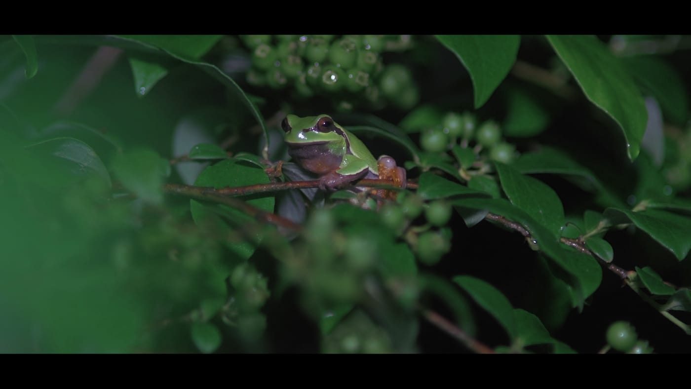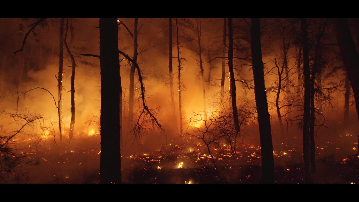 The Pine Barrens is comprised of 1.1 million acres of pine trees, acidic soil, and a network of bogs and marshes, spanning across more than seven counties. It is the largest area of undeveloped land between Maine and Florida, set within the most densely populated state in the nation. Kessler began with the intention of making a short film charting the region’s ecological and human relationships, but he ended up filming for over six years, capturing the Pinelands in every imaginable state and season. In the process of filming, Kessler fell deeply in love with the landscape, and The Pine Barrens is marked by long, lingering shots that fixate on the area’s flora and fauna — orchids moving in the breeze, water coursing over mud through reeds, mist rising off the water — in ways that appear strange and alien, heightened by the sparse and atmospheric sounds of the Ruins of Friendship. Some of the most astonishing footage is Kessler’s shots of the Pines engulfed in flame, which open the film and recur throughout it. The camera appears mere feet away from plumes of fire licking the trunks of trees and consuming underbrush. The fire is, in fact, an ecologically important natural occurrence that promotes regeneration, and it serves as a guiding metaphor for themes of destruction, mystery, and transmutation in the film.