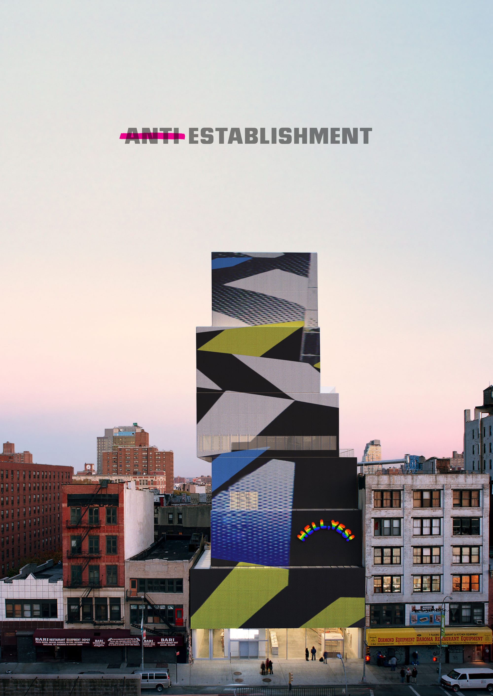 The Anti-Establishment poster mashes together the absurd coloring of Dakis Joannou’s Jeff Koons-designed yacht, the New Museum’s iconic (and expensive) structure with a sentiment many of us are wondering for some time now, “Oh, New Museum, when did you become so establishment?”