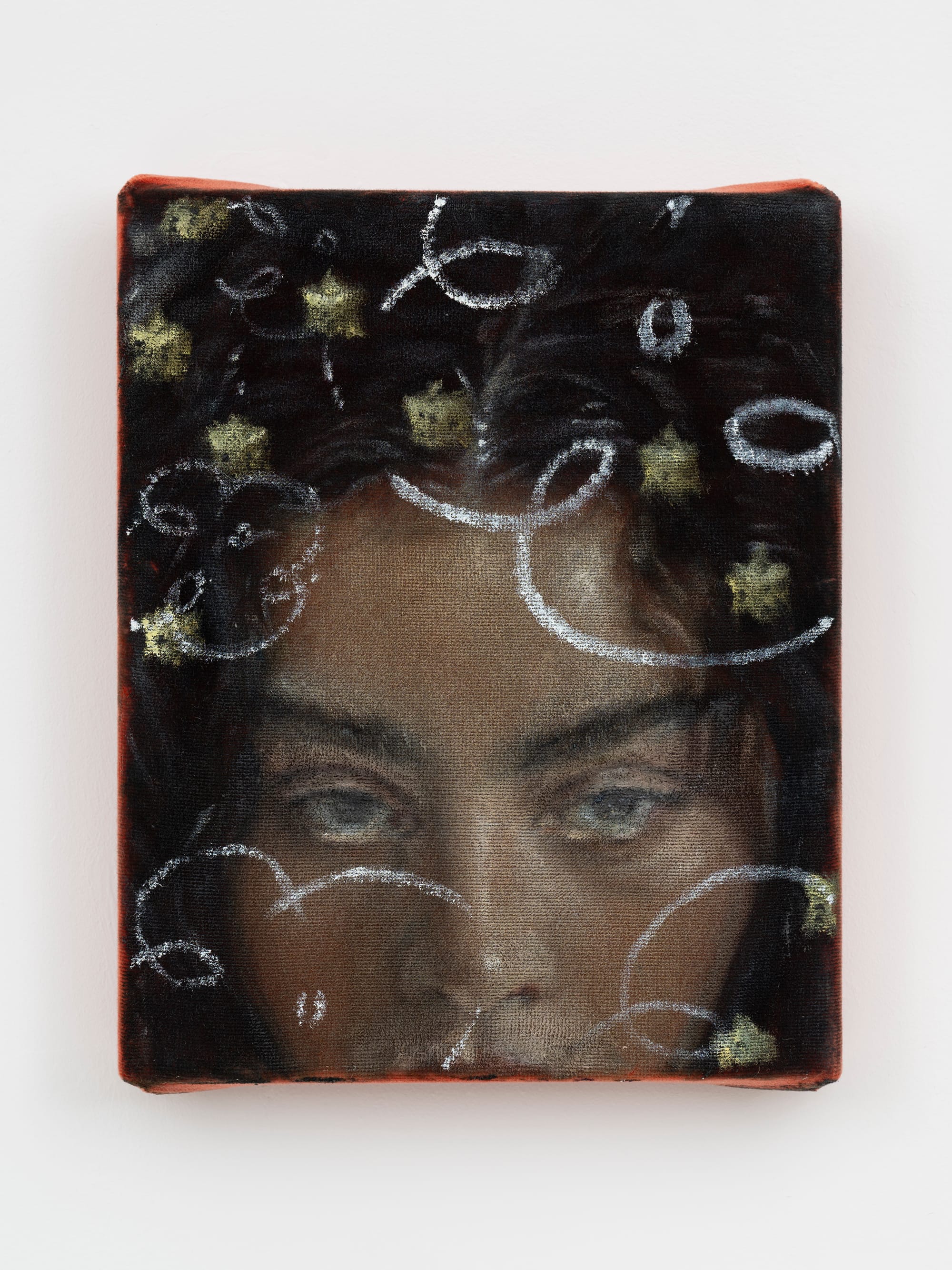 Though Charli is intentionally absent from the award-winning album's iconic, retina-singing green and blurry text cover art, Wood brings her front and center again in a simultaneously fuzzy and edgy oil portrait on equally shocking orange velvet. Depicting Charli from her cupid's bow to the crown of her head, the painter captures the arched brows and hooded eyes of the party princess's lethal stare piercing from beneath her buoyant waves.