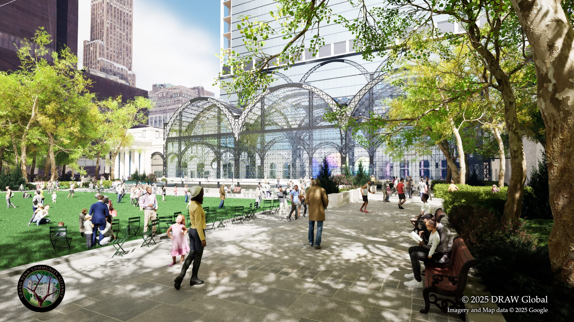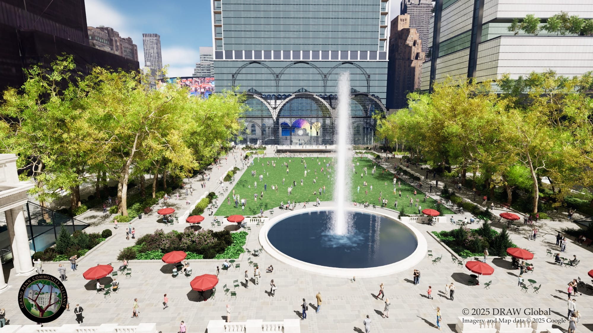 The renderings released by the Grand Penn Community Alliance show a classical façade lined with Doric columns in front of Vornado Realty Trust's PENN 2 business center at the station's Seventh Avenue entrance. GPCA's proposal would also level the contentious Madison Square Garden’s circular modern architecture entirely to make way for a grassy public plaza that's roughly the size of Bryant Park and accessorized by a fountain.