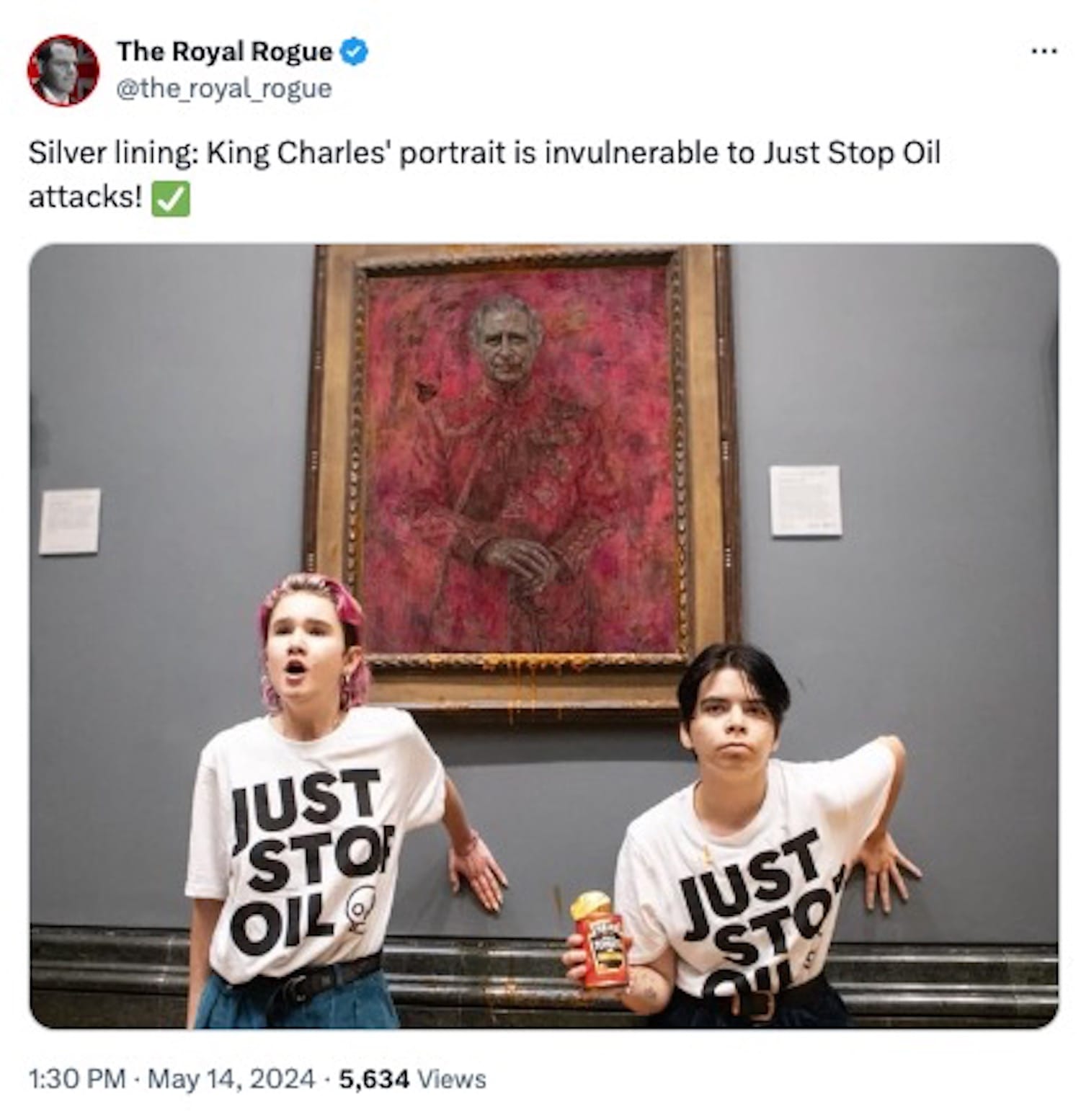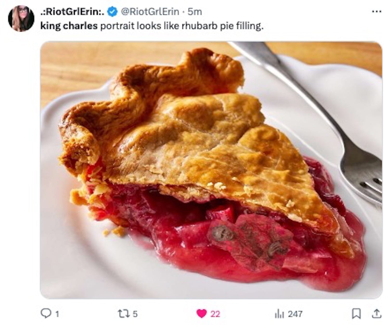 While those with food on their mind likened the portrait to a Chicago Deep Dish pizza and a rhubarb pie filling, others asked if the climate activism group Just Stop Oil had attacked the painting already.