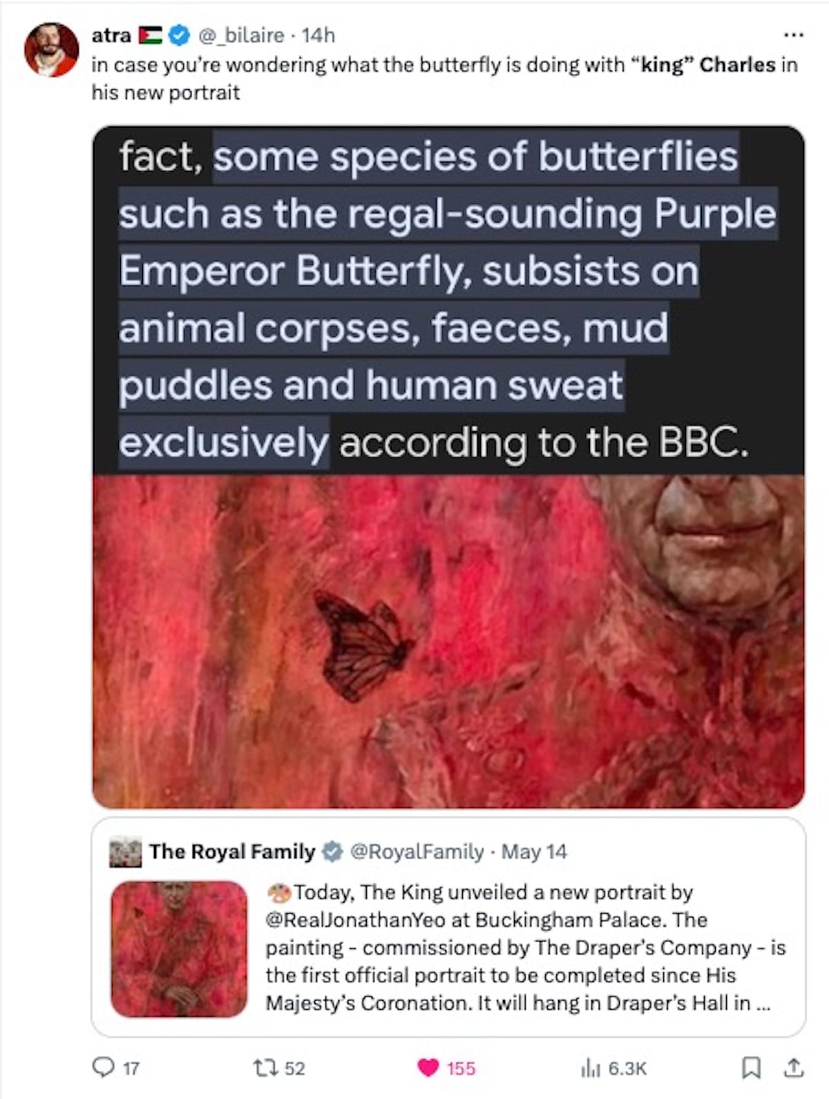 One might notice a semblance of the natural world in the painting as well, with the appearance of a butterfly hovering over the King's shoulder. Yeo noted that he included the insect as a nod to Charles's support of environmental causes and a symbol of metamorphosis, considering his transition into the British monarch throughout the painting's completion.