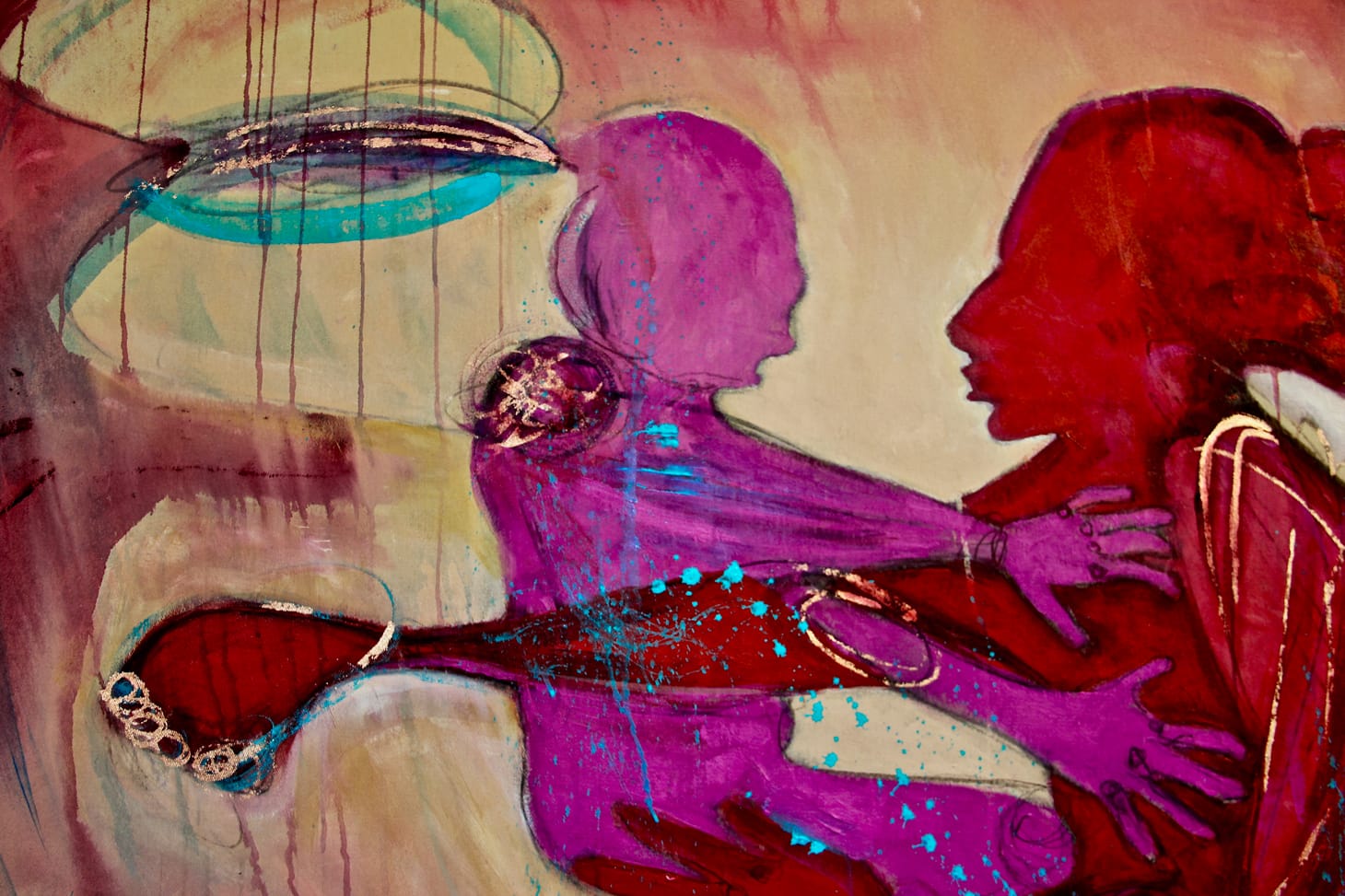 Rachel Gadsden’s work “Lost at Sea” engages with “vision” in its more metaphorical meaning — as aspiration and determination. The partially-sighted artist often explores the themes of fragility and resilience in her performative and collaborative practice. Her striking piece, “Lost at Sea,” was created in collaboration with a family of Syrian refugees (a mother and three children), who settled in Berlin after narrowly surviving their trip across the Mediterranean Sea, during which their boat capsized. The artist asked the family to lie down on a canvas so that she could trace their bodies. Then they all painted the canvas in a mixture of bright colors, with each figure in a different shade, like in Baloji’s photographs. The act of tracing bodies recalls the trope of chalk outlines at a crime scene, with the family’s bodies imagined as both living and dead. There is also the connotation of birth (each person is individually curled up in the fetal position and together in an overlapping embrace) so that the canvas itself becomes a kind of large womb.