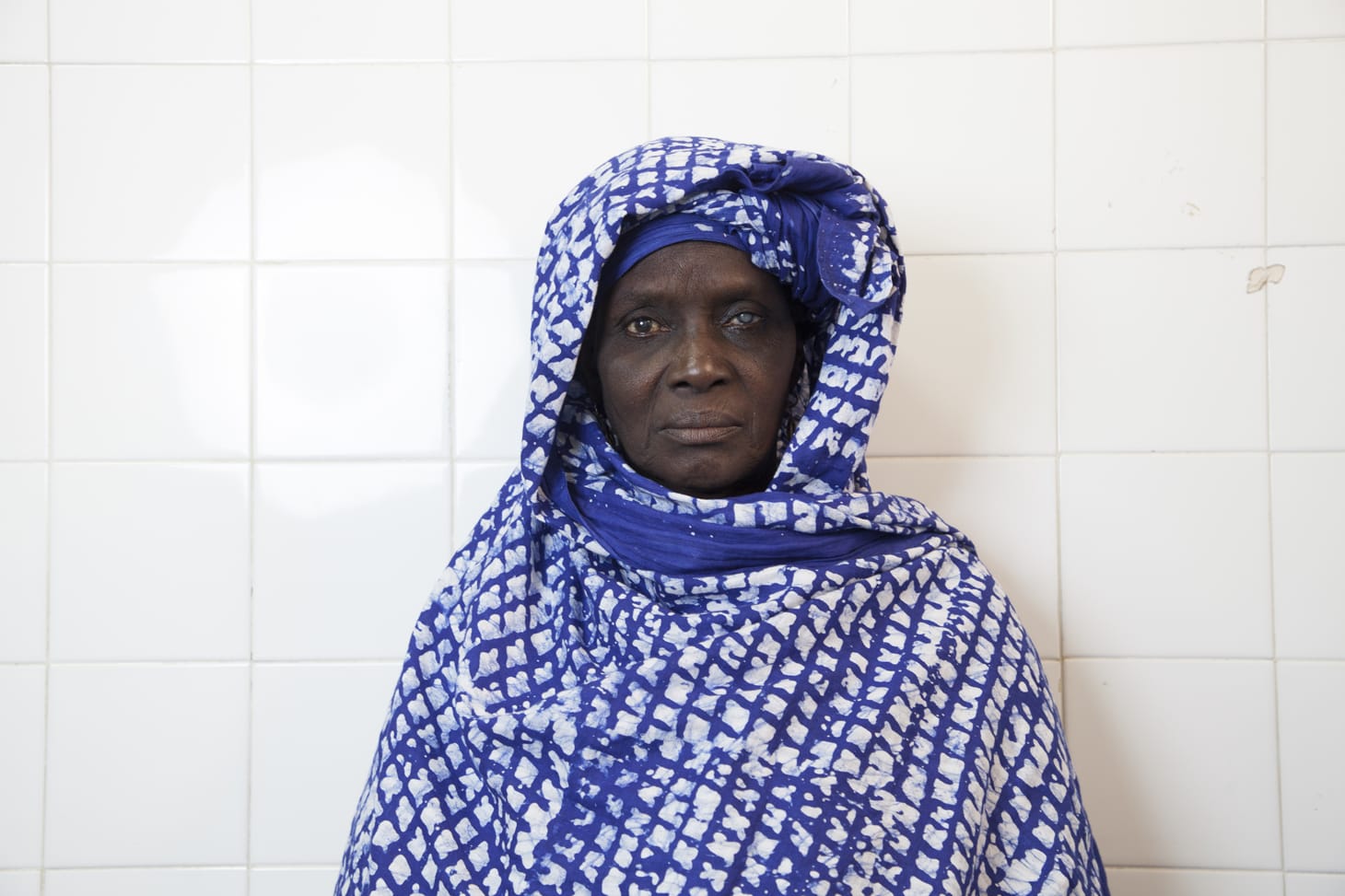 The topic of blindness is more directly confronted in other works in the exhibition. One of the most captivating works in the exhibition is Congolese photographer Sammy Baloji’s “View,” a series of seven photographs of people who have just emerged from cataract removal surgery in a Senegalese hospital. His subjects all sit in the same chair in front of a white-tiled wall. Some pensively gaze off at an angle. Others defiantly stare back at the viewer. They are dressed in vibrantly-colored clothes: bright blue coats and deep orange shawls. The curators have elegantly arranged the photographs in a sequence so that their subjects’ clothes form a rainbow of colors.