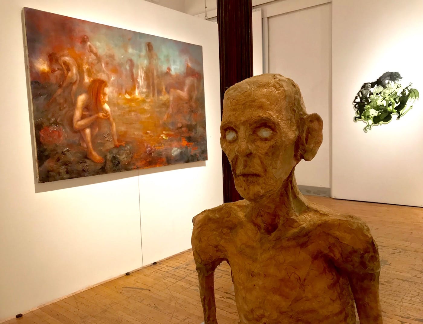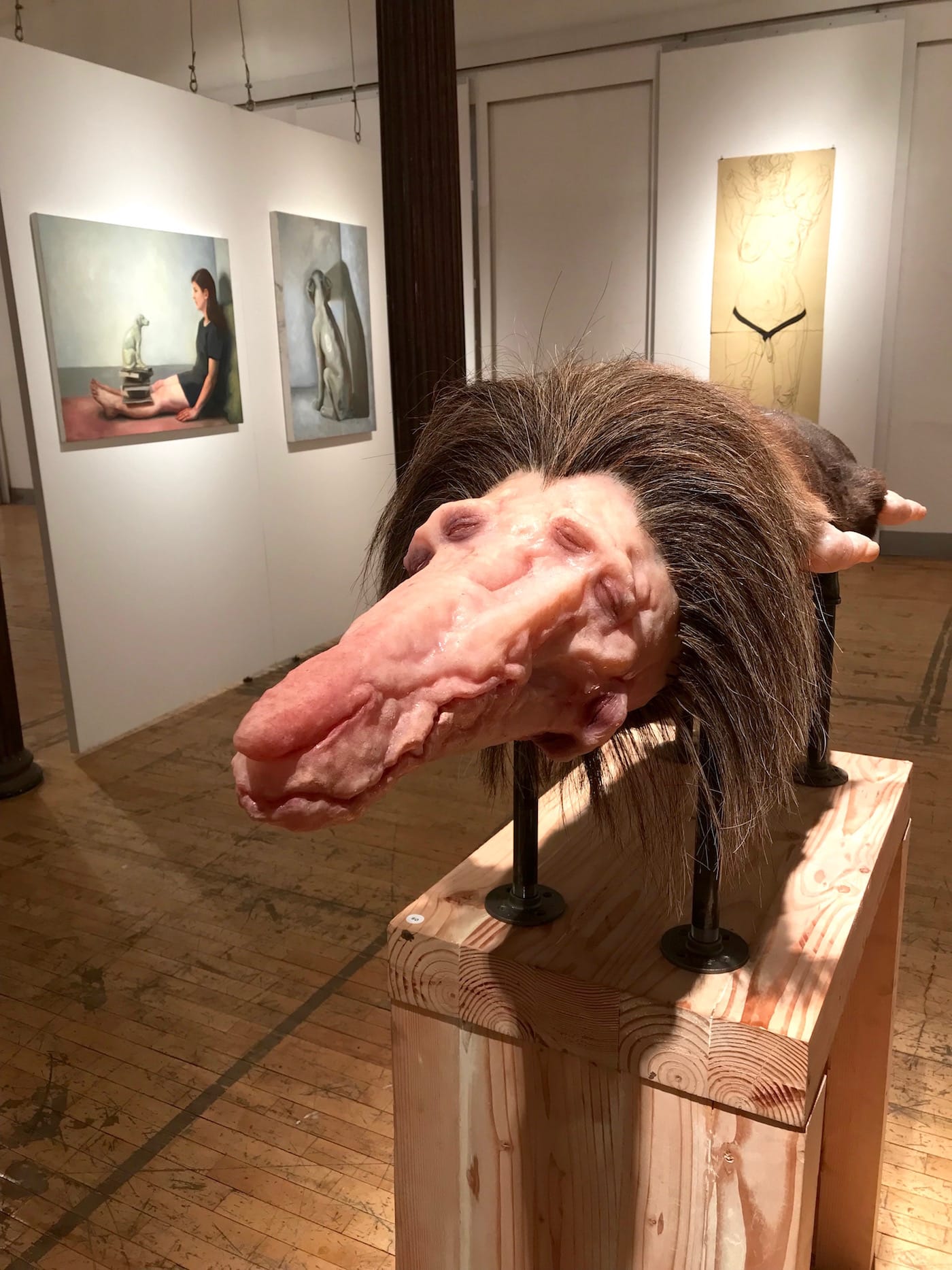 Arngrimur Sigurdsson’s nearby “Transhuman Torpedo” (2018) definitely attempts to one-up Bosch’s skeletal figure. Sigurdsson’s sculpture comes close to the quintessence of “grotesque.” It looks like a cancerous tumor on steroids, with hair growing from its mid-section and multiple eyes and fingers emerging from its fleshy mass.