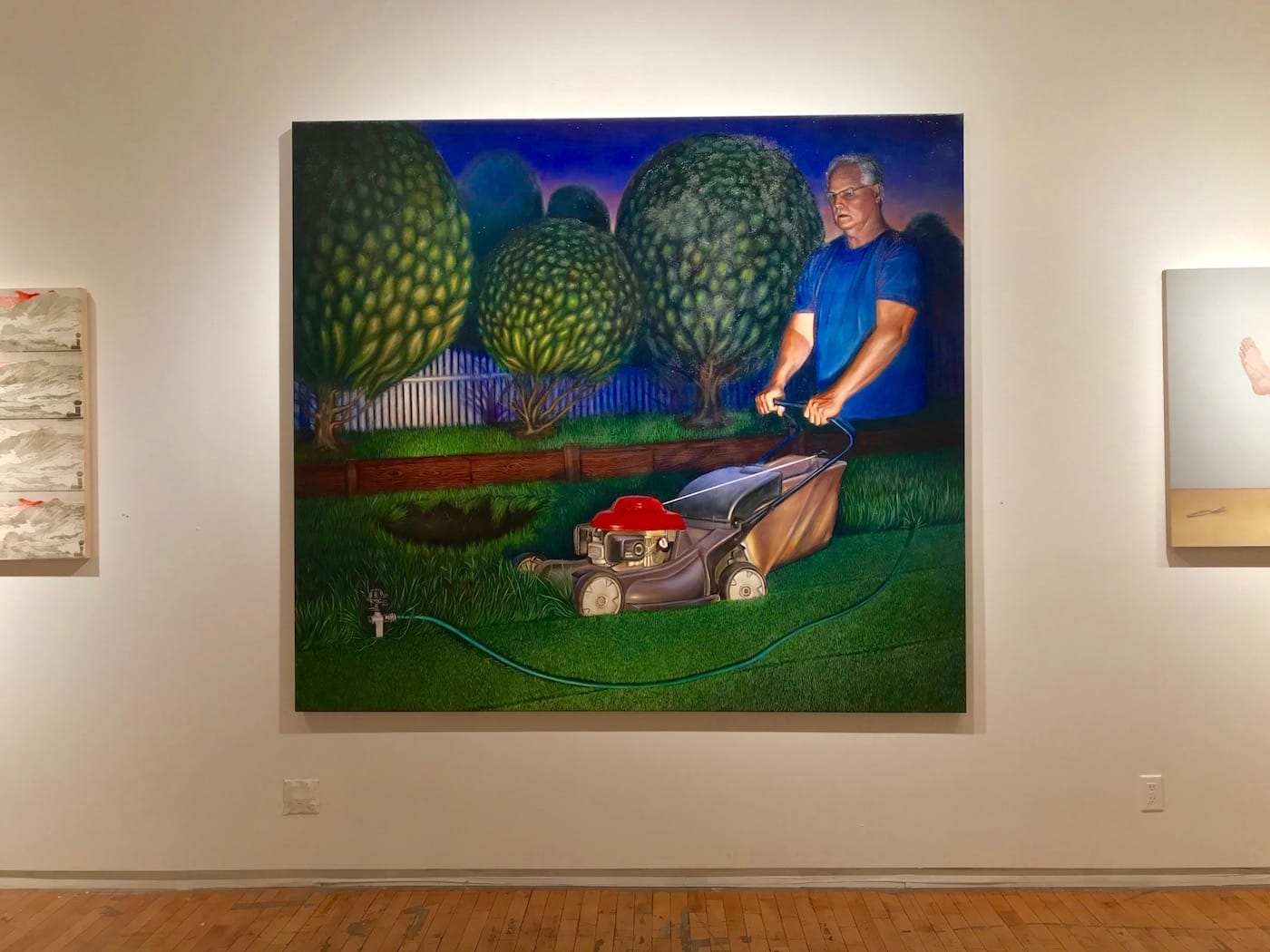 There are also more playful and quirky pieces, like Brendan Sullivan’s painting “Parallel” (2018), which takes a more surrealist approach. Here, a ghostly apparition that looks like a member of the Bush clan mows a suburban lawn under a crepuscular sky. There are certain elements that are off here: the presence of a gaping hole in the background, unnatural lighting, and (more pressingly) the complete absence of the man’s lower body. Together, these elements constitute a winning spoof on the unofficial spooky theme. It’s like parody of a parody of a suburban ghost story: the middle-aged man forever stuck mowing his lawn.