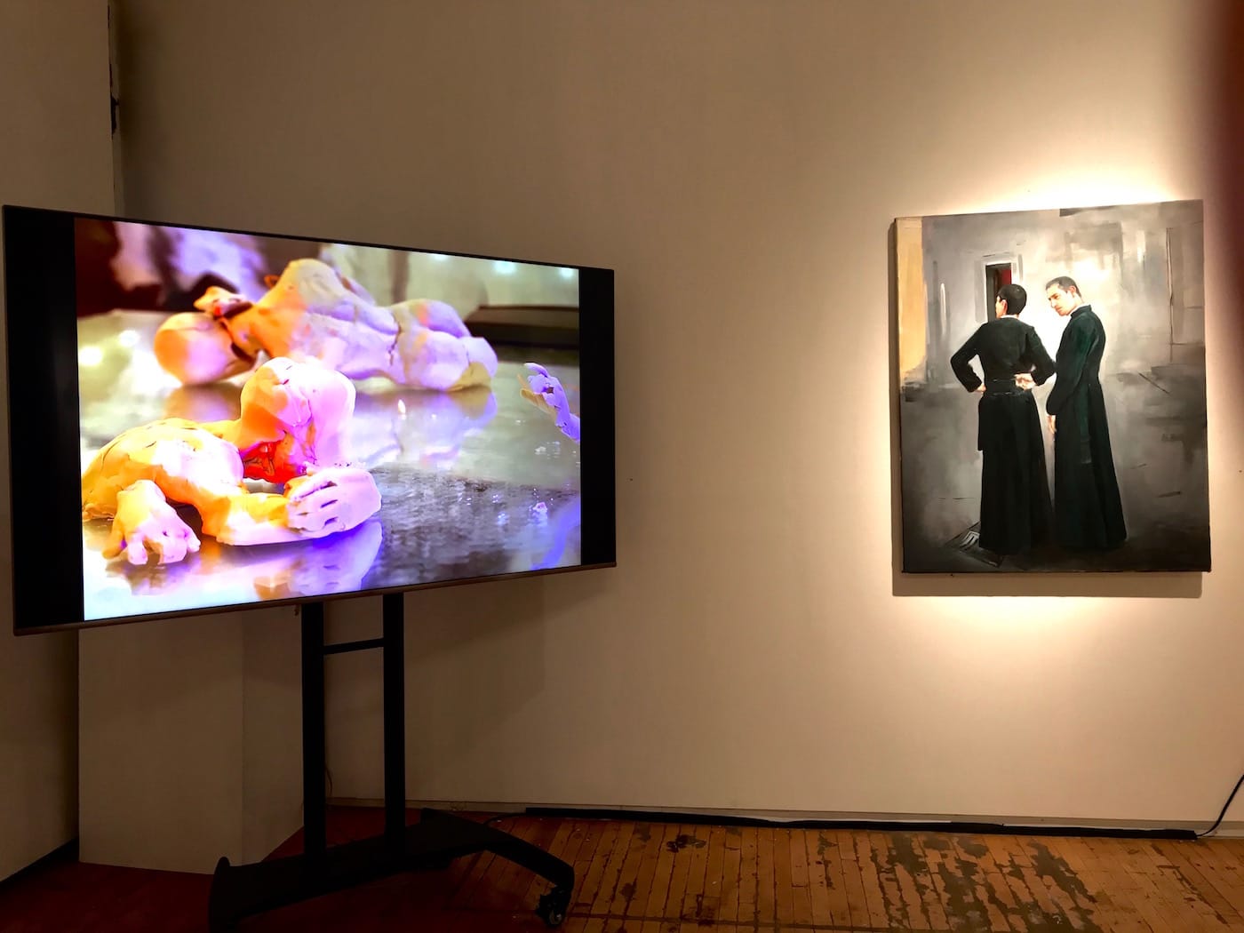 There are also some admittedly strange juxtapositions in the exhibition, an inevitable occurrence in a thesis show as big as this (44 artists in all). Most glaring is a corner where Erin Pollock’s “Sui Generis” (2018) is juxtaposed with Salomé Pereira’s “Priests” (2017). The former is a gruesome mixed media animation where a claymation figure appears to continually split open his head and eat himself. The latter is, well, a painting of a pair of priests.