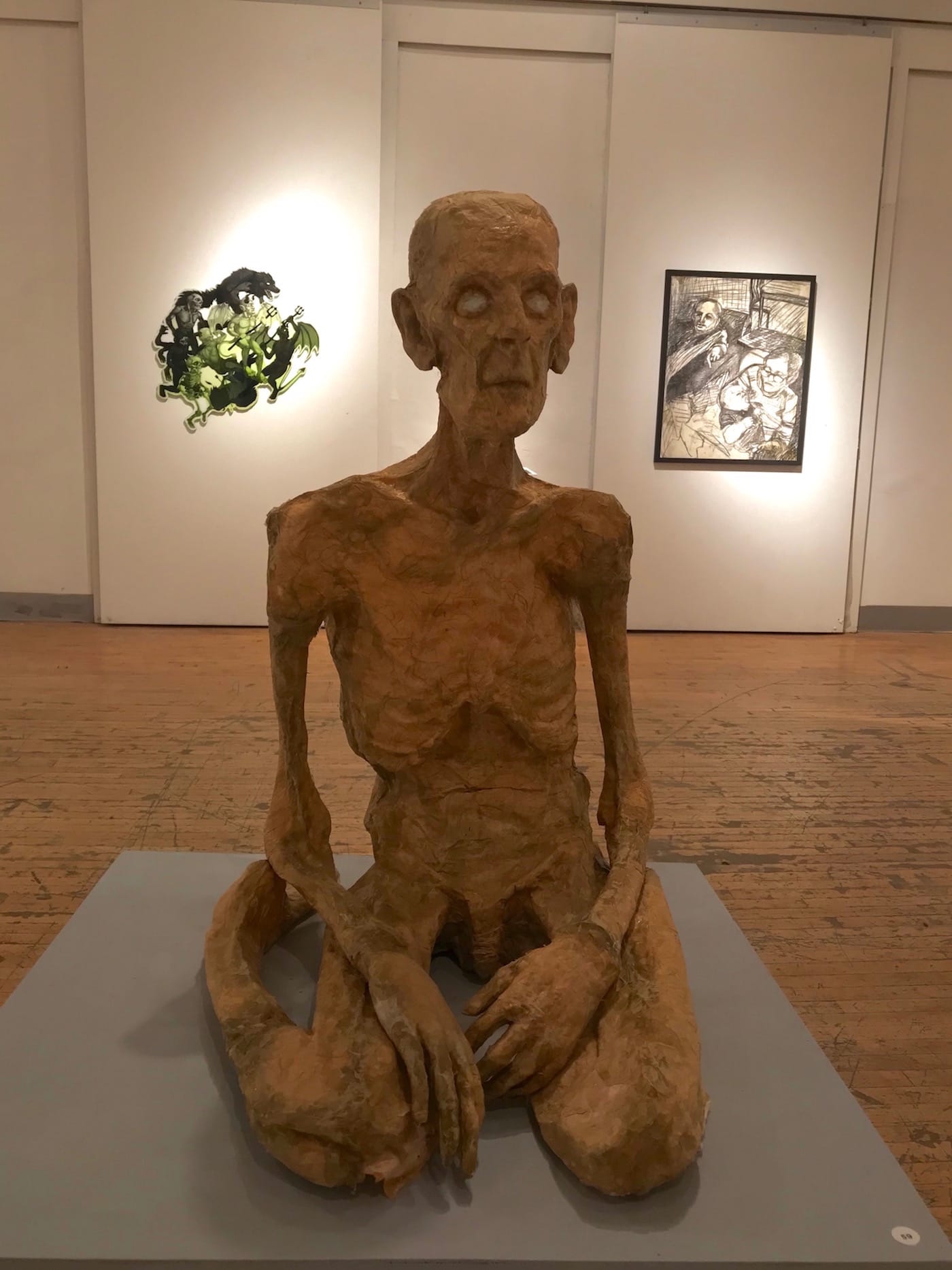 Katie Bosch’s “Emaciation” (2018) sculpture commands the gallery from the room’s center. This papier-mâché mummy, built with hog casing, evokes the embalmed remains of Buddhist monks. With its eyes glazed over and hauntingly gaunt body, it can seem a little intimidating, but closer inspection reveals the artistry of Bosch’s brushstrokes and papier-mâché structure.