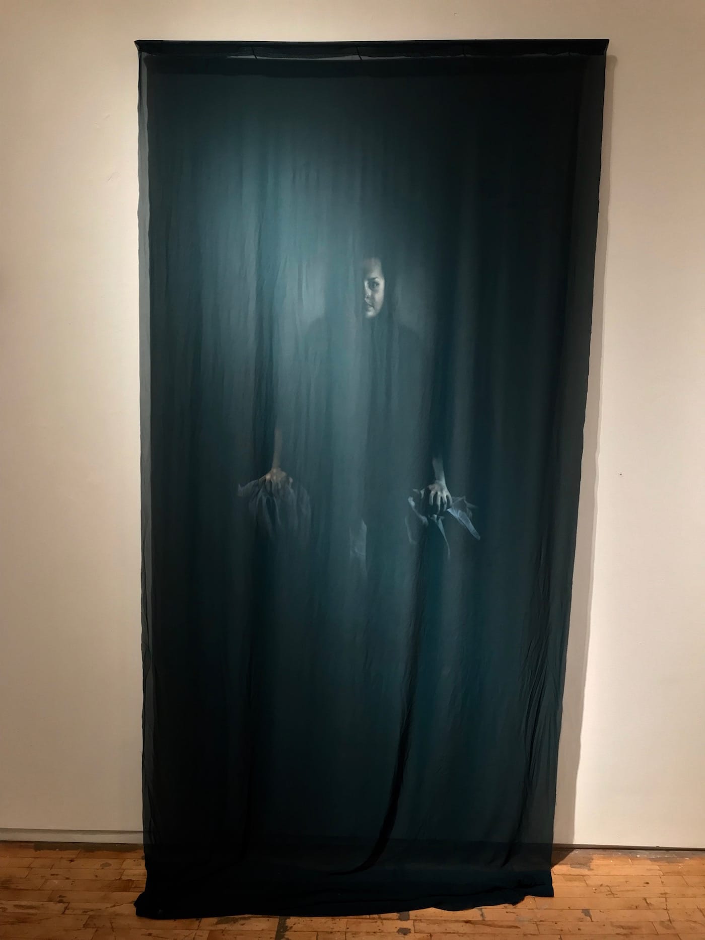 While I definitely enjoy the thrill of Bosch and Sigurdsson’s ghoulish creations, I especially love Sian Smith’s particularly haunting imagery. Her “Self-Portrait” (2018) is a delicate oil painting on chiffon fabric. Confronting the viewer with a direct gaze, Smith clutches two pieces of fabric in her clenched fists, perhaps a meta-acknowledgment of what must have been a painstaking process to create this piece.