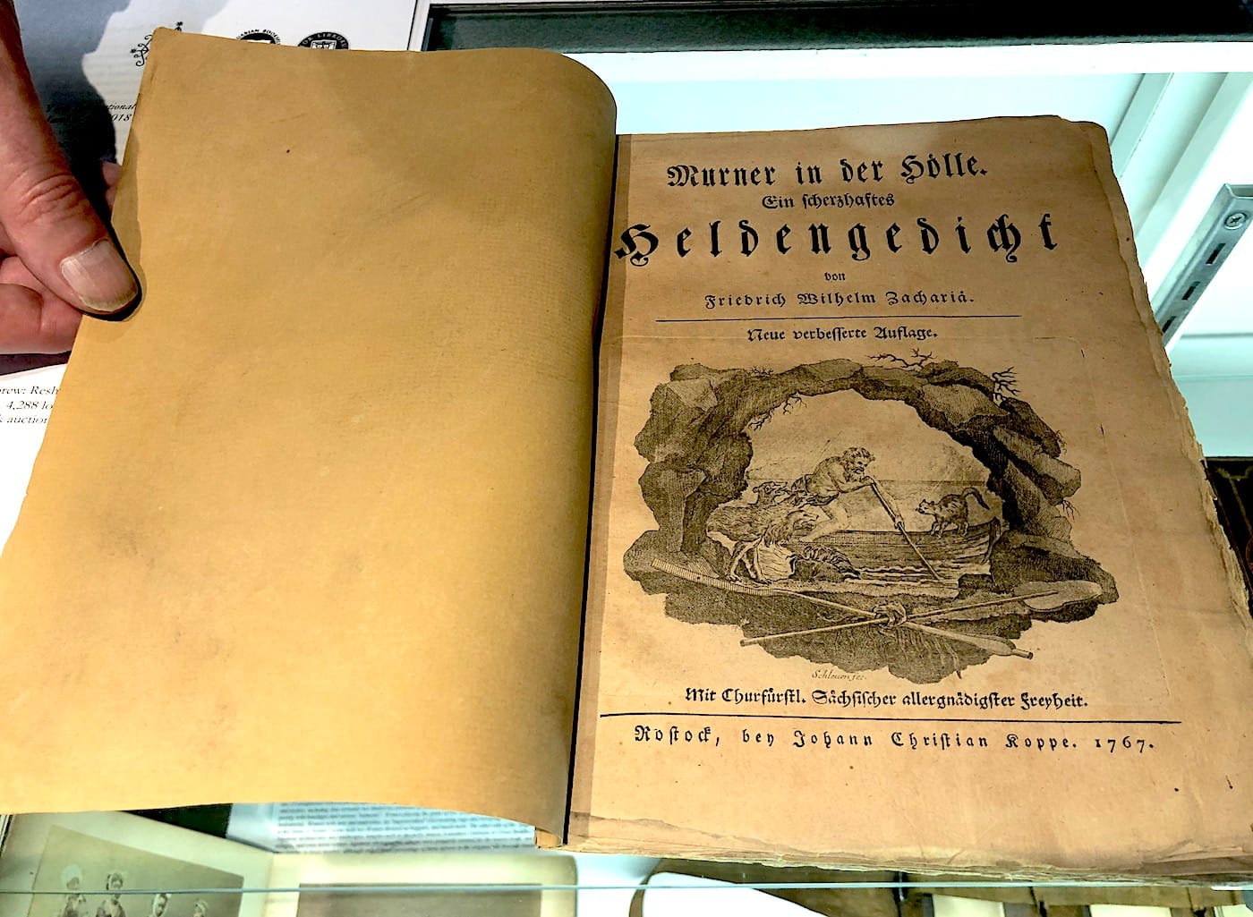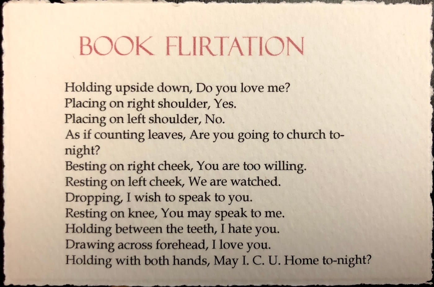 While most of the booksellers are as overwhelmingly reserved, white, and male as most gallerists at art fairs, there are some sellers who are eager to share their knowledge, even if you aren’t buying anything. Laird, for instance, excitedly pulled out a delicate book from 1767 about “the revenge of Merner the kitty” — an animal who goes to hell for not being buried properly. And, he says, if one item were to win the “geek contest prize” it would be his 1814 sales catalogue from the library of a “noted Dutch theologian.” Equally delightful is the business card of Electibles, a collection that specializes in childhood ephemera and books; one side of the card cites a poem titled “Book Flirtation,” from a series of Victorian “flirtation cards,” in which the first line reads, “Holding upside down, Do you love me?”
