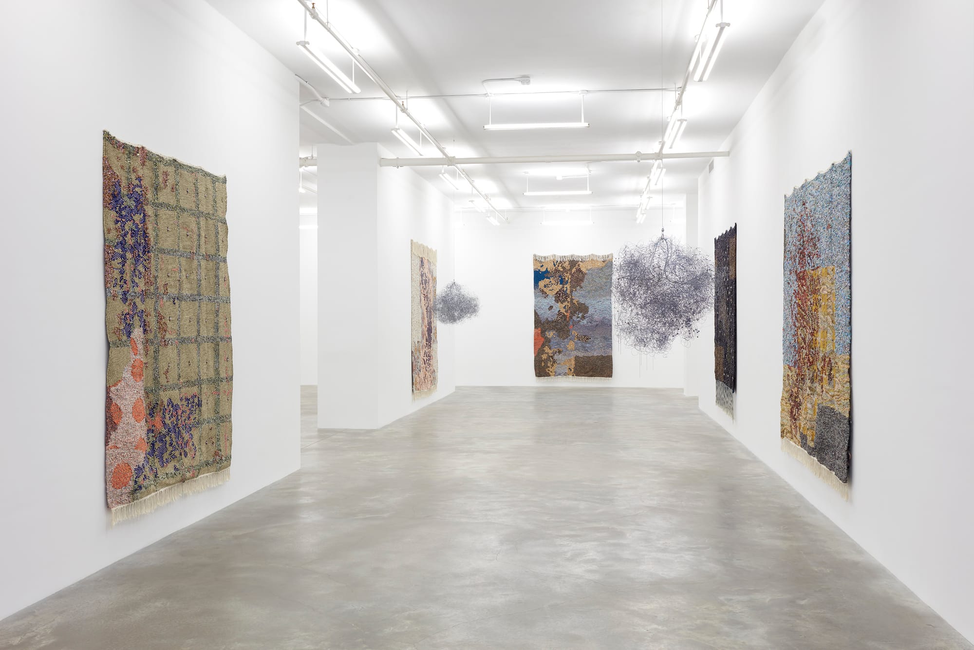 Titled after an Afrikaans phrase meaning “to gain ground,” Veld Wen presents ten wall-mounted tapestries and five hanging sculptures by Igshaan Adams, a Cape Town-based artist who navigates his cultural and religious contexts across weavings, installations, and performance. The tapestries, which combine materials as varied as wood beads, nylon rope, and silver and gold chains, take their design from pieces of linoleum flooring excavated from his neighbors’ homes, while the nebulous suspended sculptures, constructed from wire fencing and material found around the studio, are inspired by the Indigenous Riel dance that he witnessed his grandparents perform.