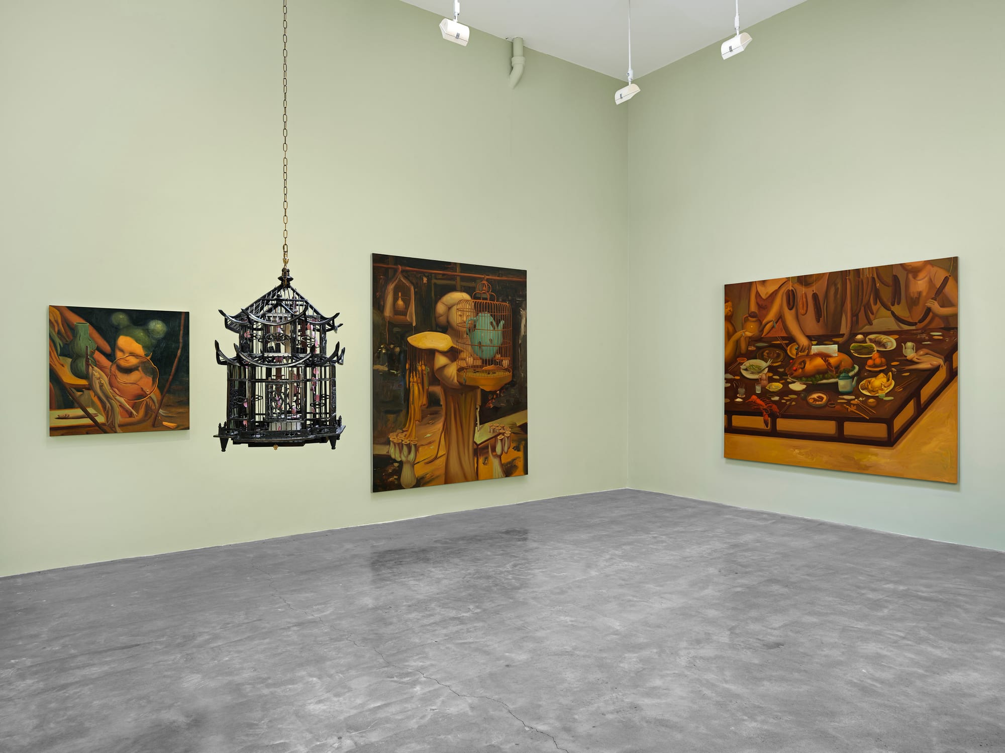 It’s Not Polite To Stare, an exhibition of painting and sculpture by Dominique Fung, critiques the Orientalist fetishization and ornamentalization of women’s bodies and Asian cultural objects. Hanging artisanal bird cages, which the Ottawa-born, Brooklyn-based artist purchased from estate sales, house ceramic forms; the ornate cages and their unexpected inhabitants reappear as motifs in Fung’s surreal paintings.