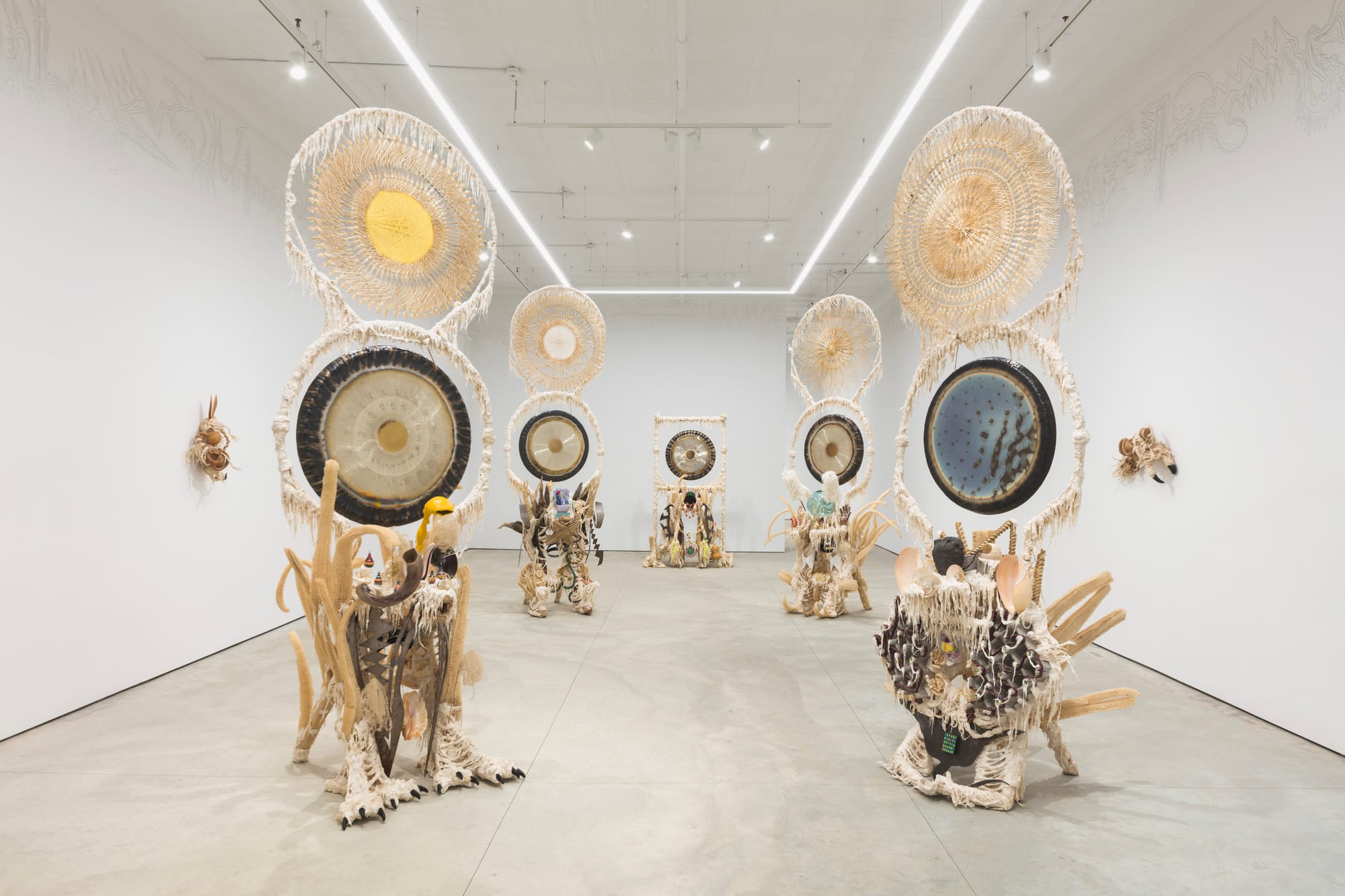 Referencing his own experiences of immigrating to the US alone as a child to escape the Salvadoran Civil War as well as his struggles with colon cancer, transdisciplinary artist Guadalupe Maravilla considers the ways in which trauma can lodge itself in the body, and the radical potential for healing through non-Western practices. The exhibition, Maravilla’s first with the gallery, displays freestanding “healing machines” inspired by sound therapy; gourd sculptures that represent the stomachs of ancestors; and retablos, or small devotional paintings, that he commissioned from a fourth-generation retablo painter in Mexico.