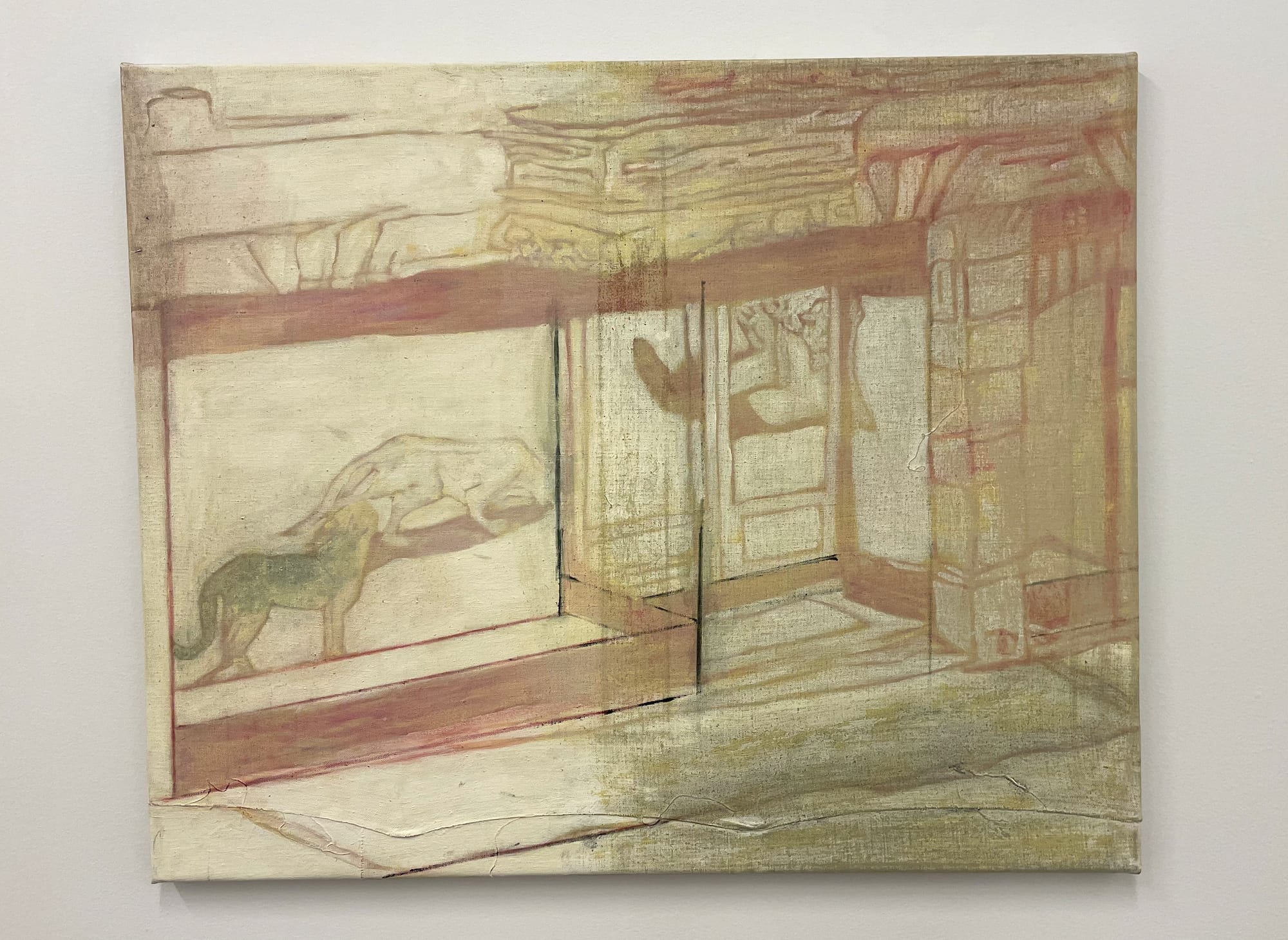In Samuel Hindolo’s “Saïda (Parvis)” (2024), a muted oil palette of pale pink, cream, and mossy gray-green lends a mysterious aura to an image of two animals cavorting in what looks like a storefront window. The washed-out scene, where color seems to hold back lest it feel too insistent, recalls the work of Luc Tuymans and others skilled at depicting absence in presence. Yet Hindolo’s animals hint at narrative, and even whimsy. In fact, the entire show is loosely cohered by a narrative based on a 1913 silent comedy short, “Saïda A Enlevé Manneken-Pis.” In the film, an escaped leopard runs amok in Brussels and knocks down the iconic titular statue. Several works in the show feature the leopard, but only “Saïda (Two Scenes, One Predicament)” (2024) portrays an active scene, as police stalk the animal. In others, we see her as an incomplete sketch or emerging, ghostlike, from a field of soft color.