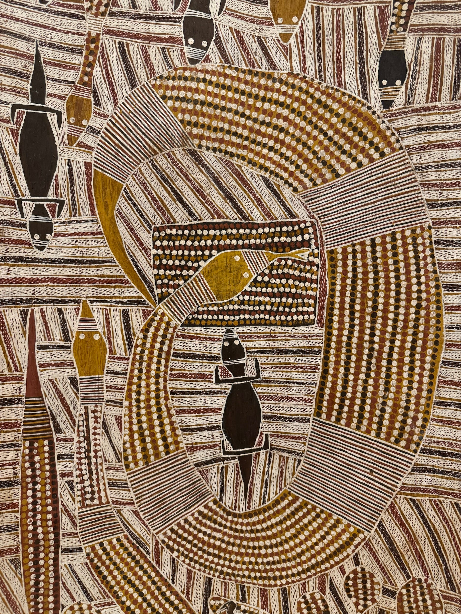 As soon as I stepped into the Asia Society’s monumental display of Aboriginal bark paintings, I realized that the 90 minutes I scheduled for myself was not nearly enough time to take in their majesty. Maḏayin brings together eight decades of mesmerizing work from the Yolŋu people, who reside in the Yirrkala region of northeast Australia. Wall texts tell relate how in the 1930s, after years of violent tension with White Australia, they began painting large strips of eucalyptus bark with designs that had been passed down through millennia as critical expressions of artistic diplomacy and political statements of sovereignty over their land, some of which were key to obtaining land and water rights for their people. And the works themselves are nothing short of sublime. Entrancing patterns painted with natural pigment tell stories that have remained part of Yolŋu culture for tens of thousands of years. I spent another two hours in the galleries this past week — and I’ll be back again for one last mind-expanding visit before the show closes.