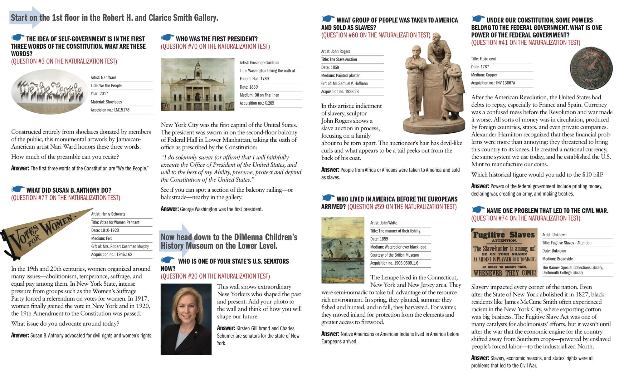 The museum has also created a scavenger hunt that any visitor can participate in that focuses on objects on view related to test questions on the naturalization exam. Question #3, which asks about the first three words of the Constitution, for instance, leads you to Nari Ward’s “We the People” installation, which he made of donated shoelaces. Question #58 — “What is one reason colonists came to America? ” — takes you to George Henry Boughton’s 1867 painting of Pilgrims going to church, as an illustration of those escaping religious persecution or in search of economic opportunity. The guide is a smart way to animate the New-York Historical’s rich holdings and steers people away from rote memorization, instead learning through a visual and cultural method.